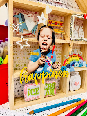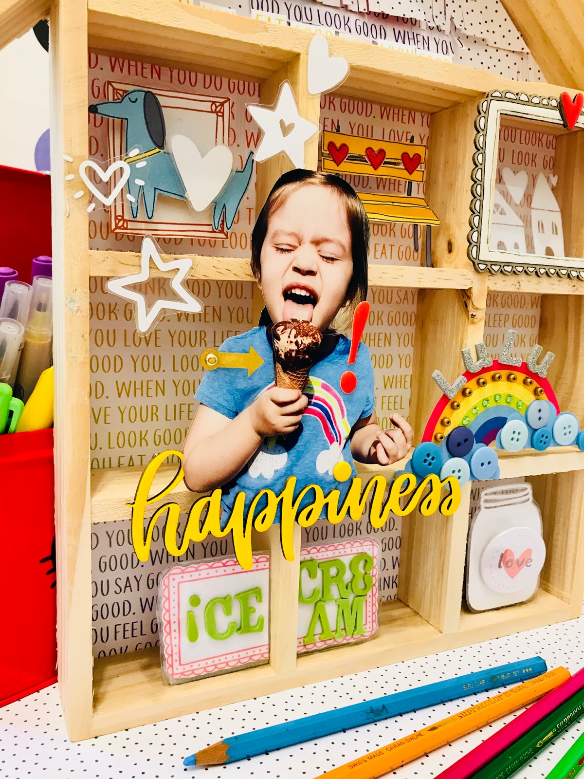 1) Usar uma ou mais fotos recortadas no seu diorama. Você pode imprimir a mesma foto 2x e usar alguma parte dela para dar um efeito tridimensional. No meu diorama, eu recortei o braço com o sorvete e colei com fita banana na foto original. Veja se dá para ver o efeito aqui...