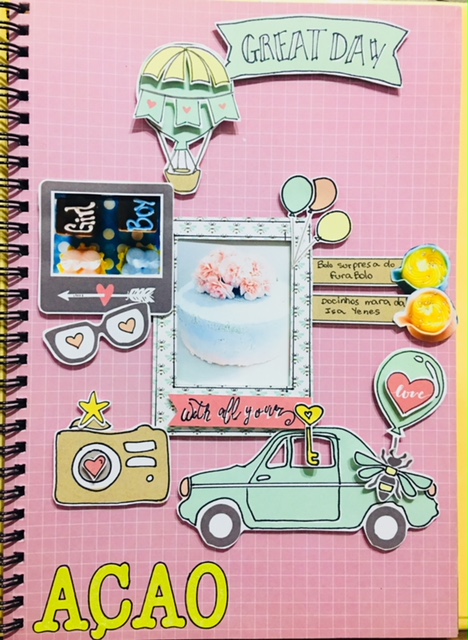 Nestas duas páginas sobre a decoração e os docinhos, usei muita caneta preta ponta final molhada para os contornos, muitos recortes e algumas criações como, por exemplo, o balão.