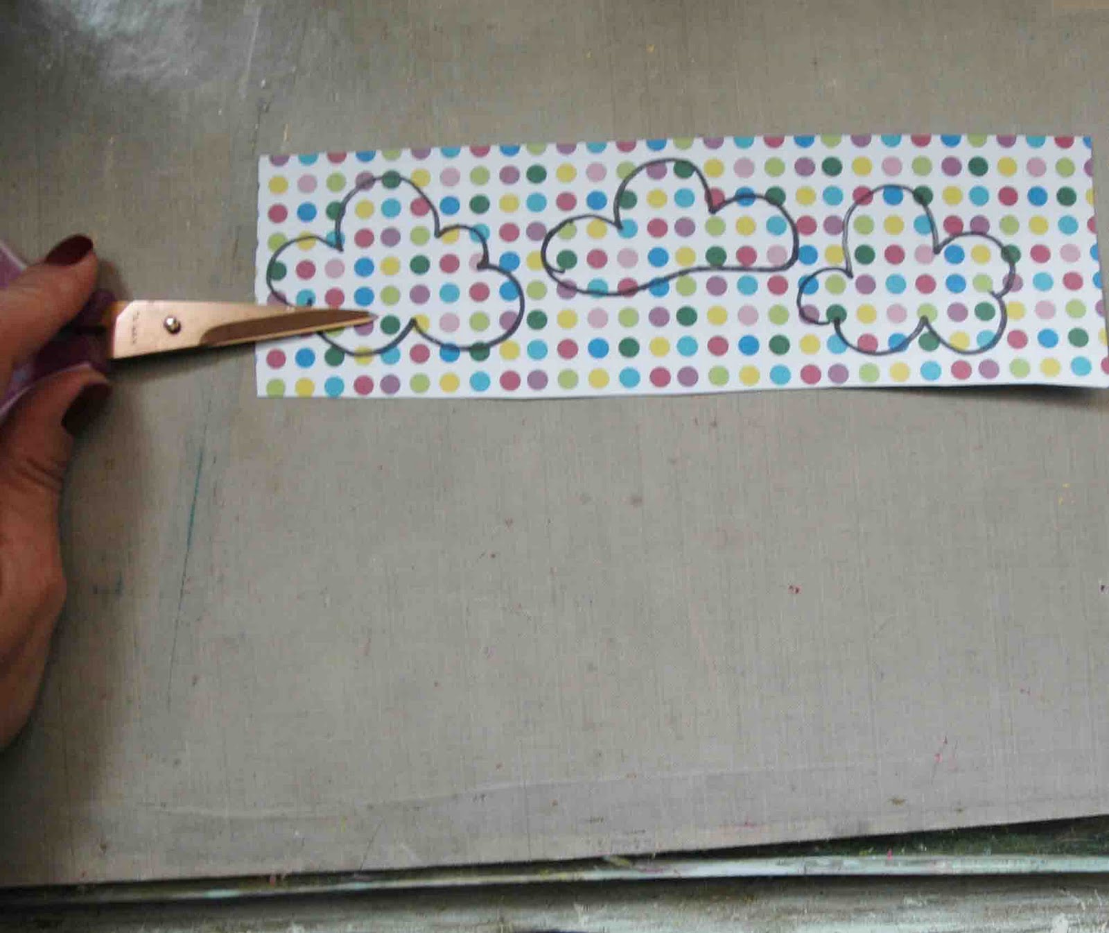 Enquanto isso desenhe a mão livre ou use um molde para fazer três nuvens no papel de bolinhas coloridas.