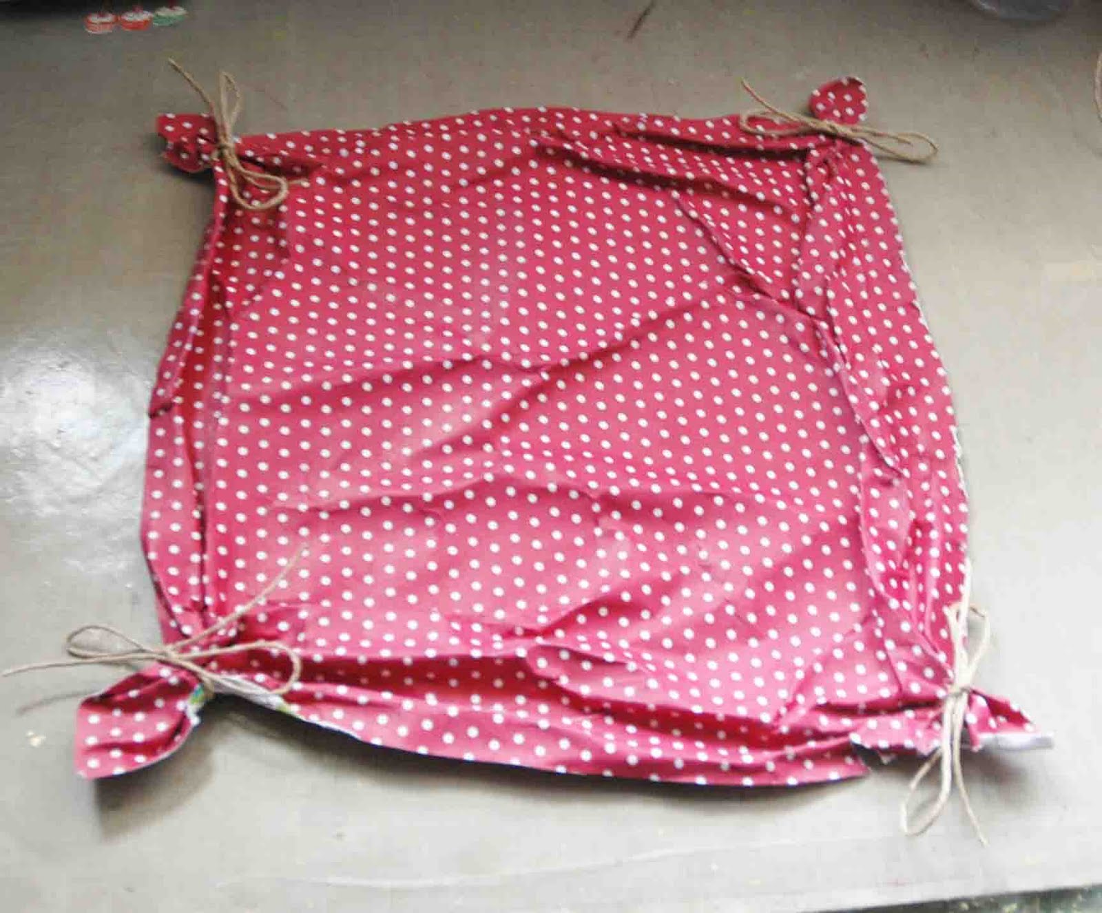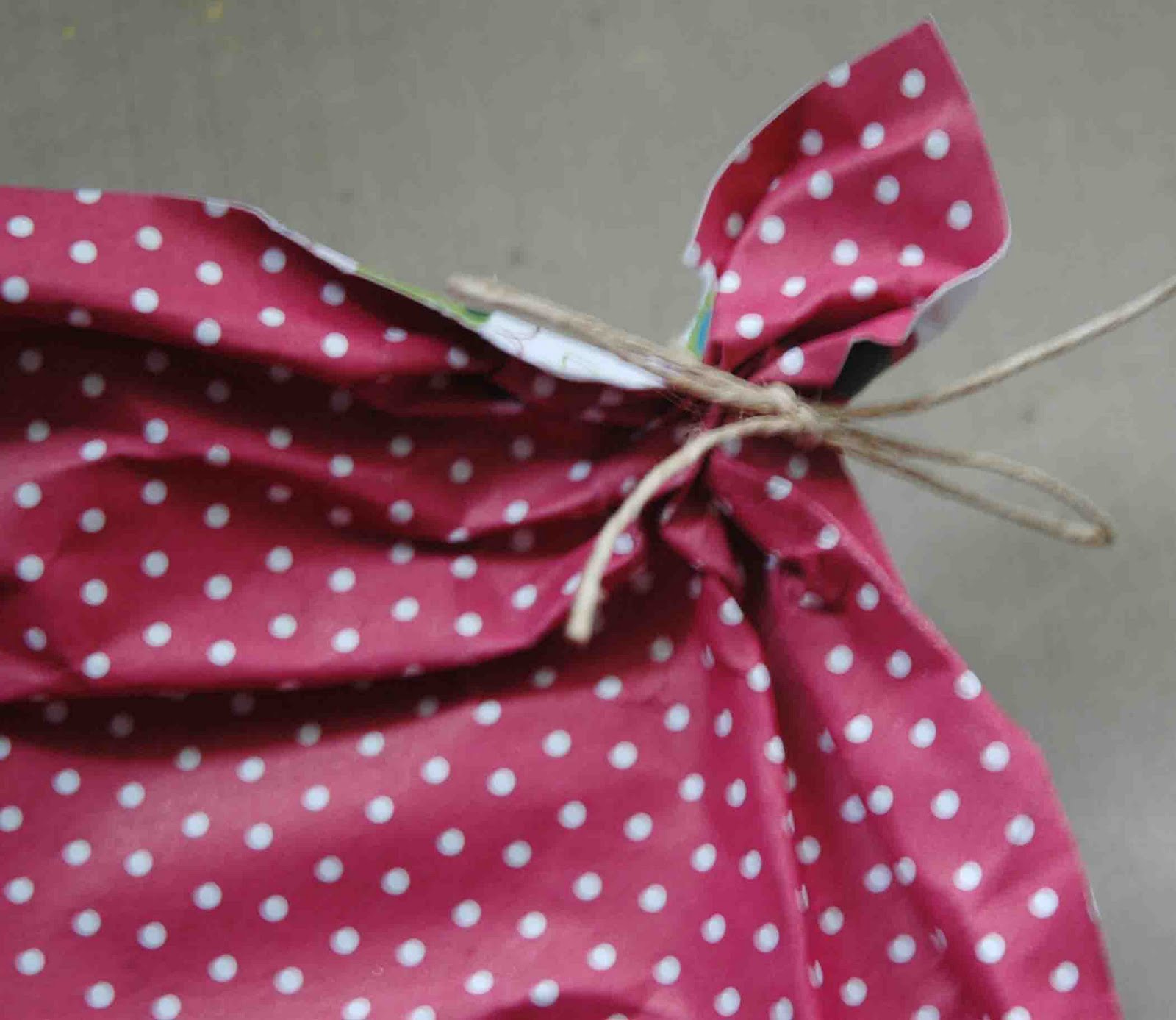 Agora amarre com um barbante ou cordão os quatro cantos do papel.