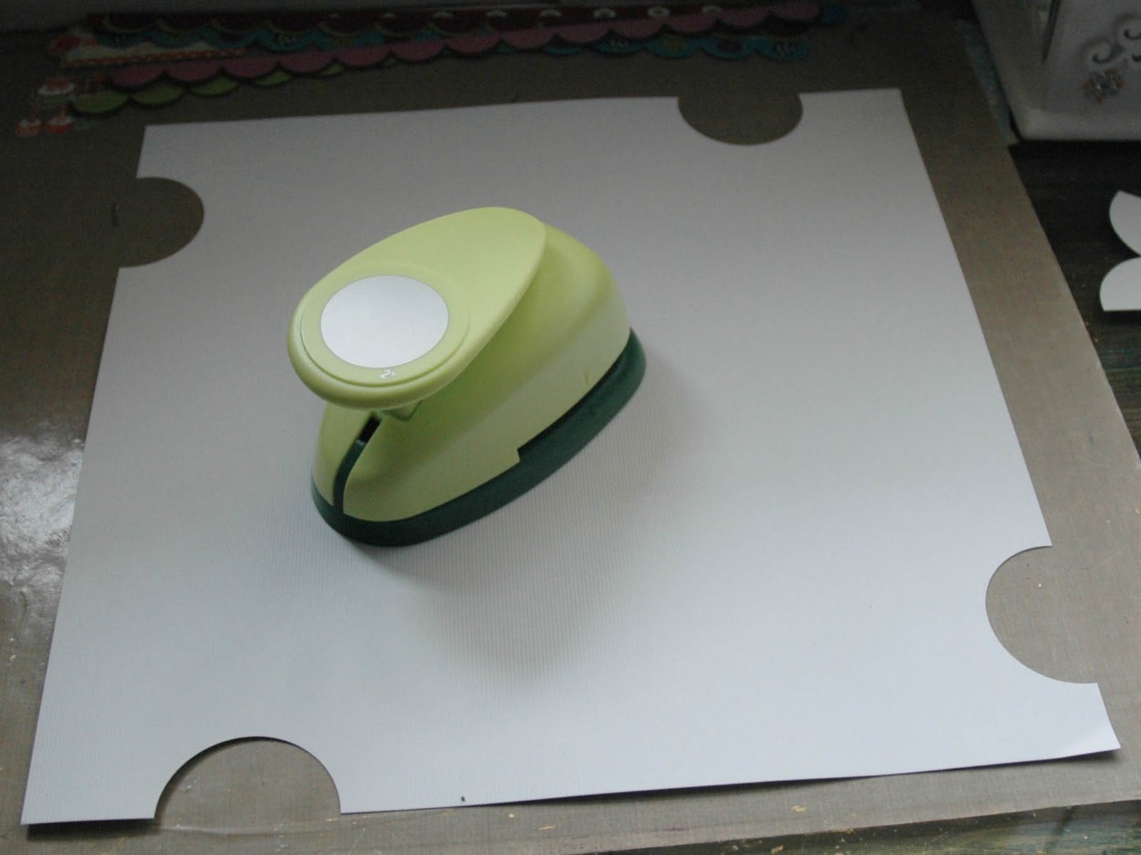 Pra começar peguem o furador de bola grande e façam 4 meia luas.Uma em cada canto do seu cardstock.