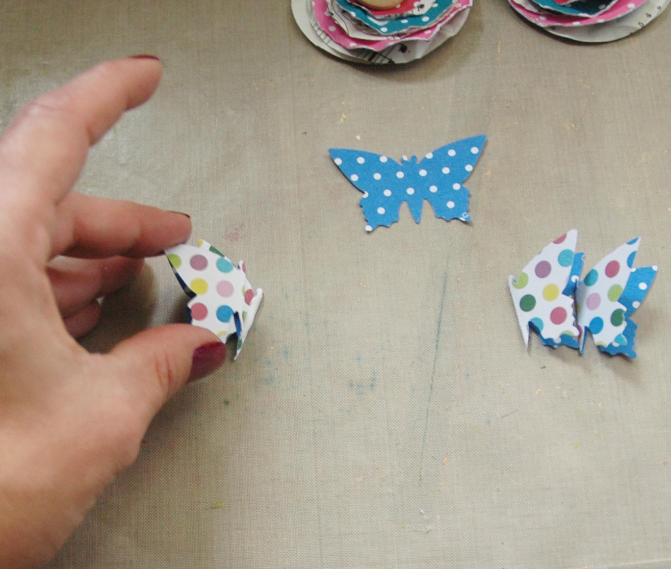 Agora pegue 4 borboletas e dobre-as ao meio como você vê na foto.