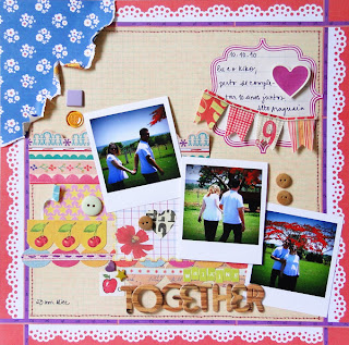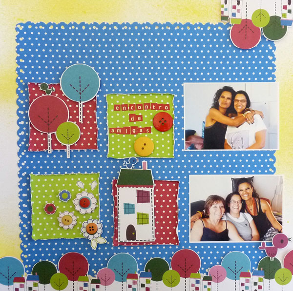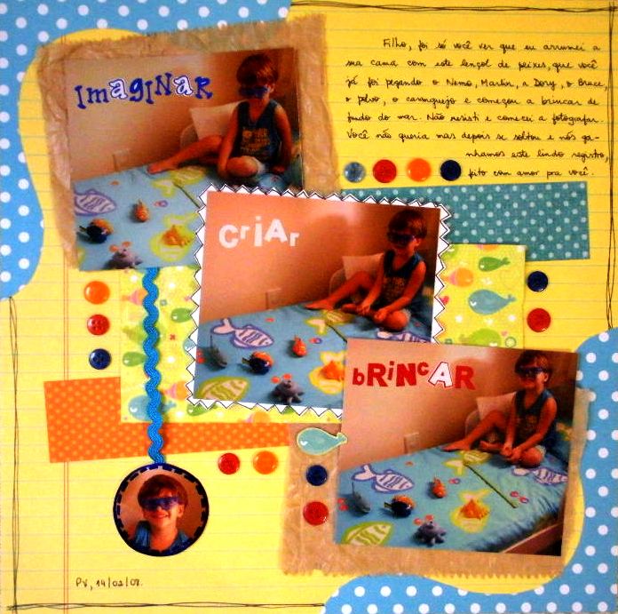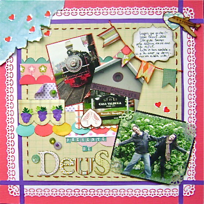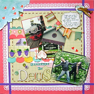 Adorei fazer essa página. Usei os pps novos da Goodies, transparências, fita, carimbeira nas bordas e nas nuvens,chipboard com relevo, botton goodies,primas, brad, botões e tinta que não pode faltar numa página da Megui né. Eu adoro essa foto e fazia tempo que queria usá-la, acho que combinou bem com os pps e o título.