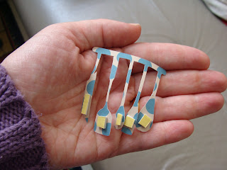 12) Pegue o furador de círculo pequeno e faça 2 furos em semicírculo na linha horizontal de baixo do retângulo bege, do lado direito, e na linha horizontal de cima do retângulo rosa, do lado direito. Esses furos vão marcar os a altura onde vai ser passado o barbante listrado. Se não tiver um furador deste tipo, você pode riscar os semicírculos nesses pontos usando um dos botões do Kiss e recortar com a tesoura ou estilete.
