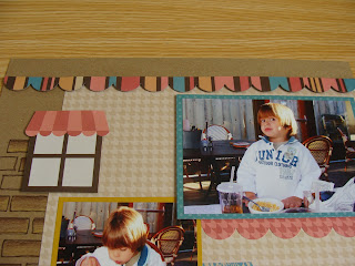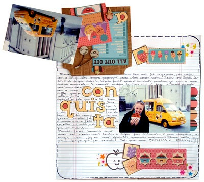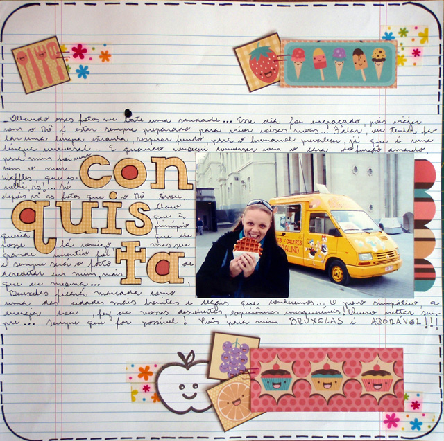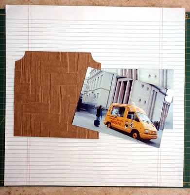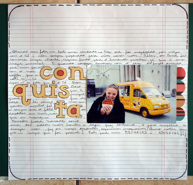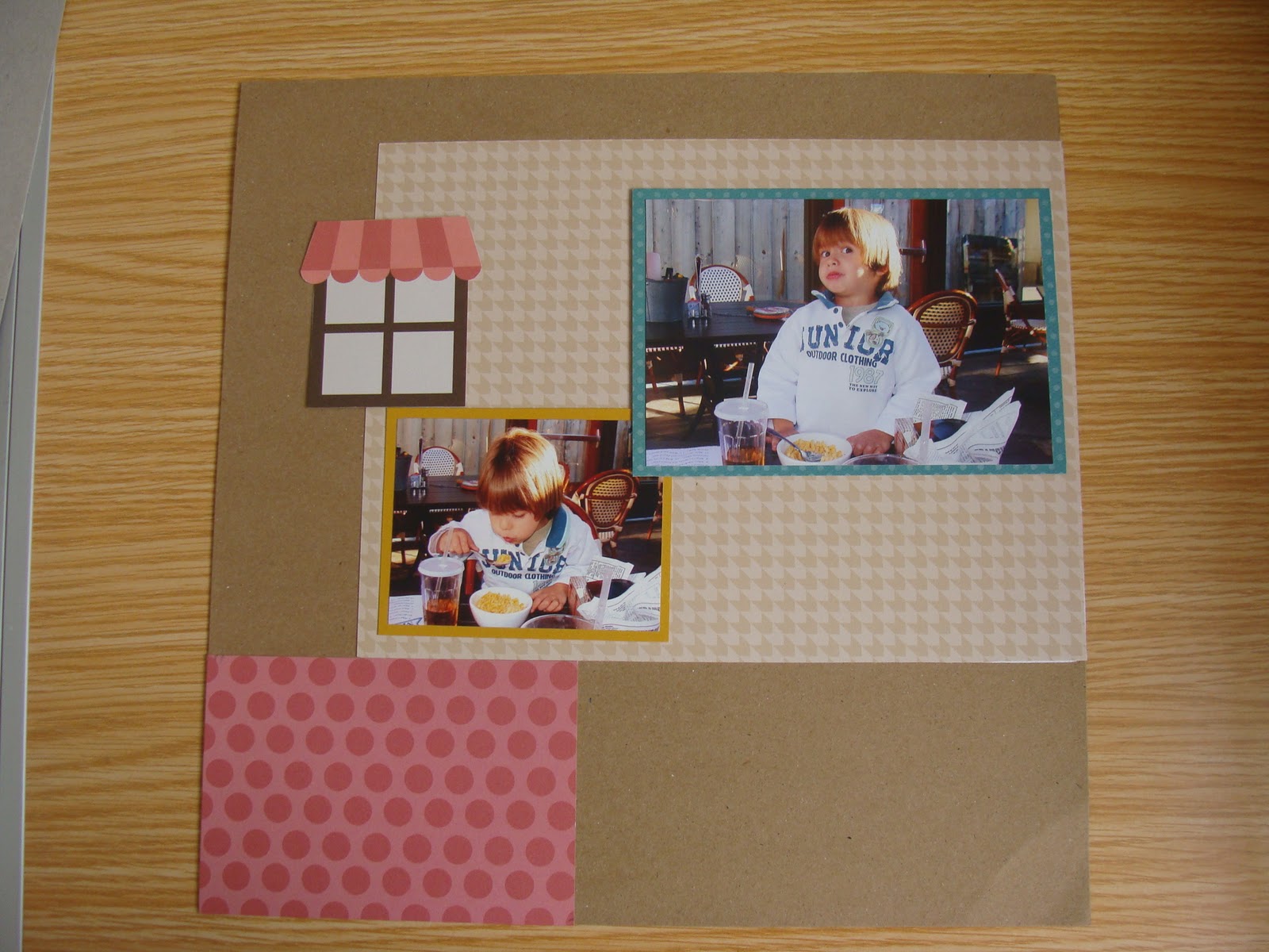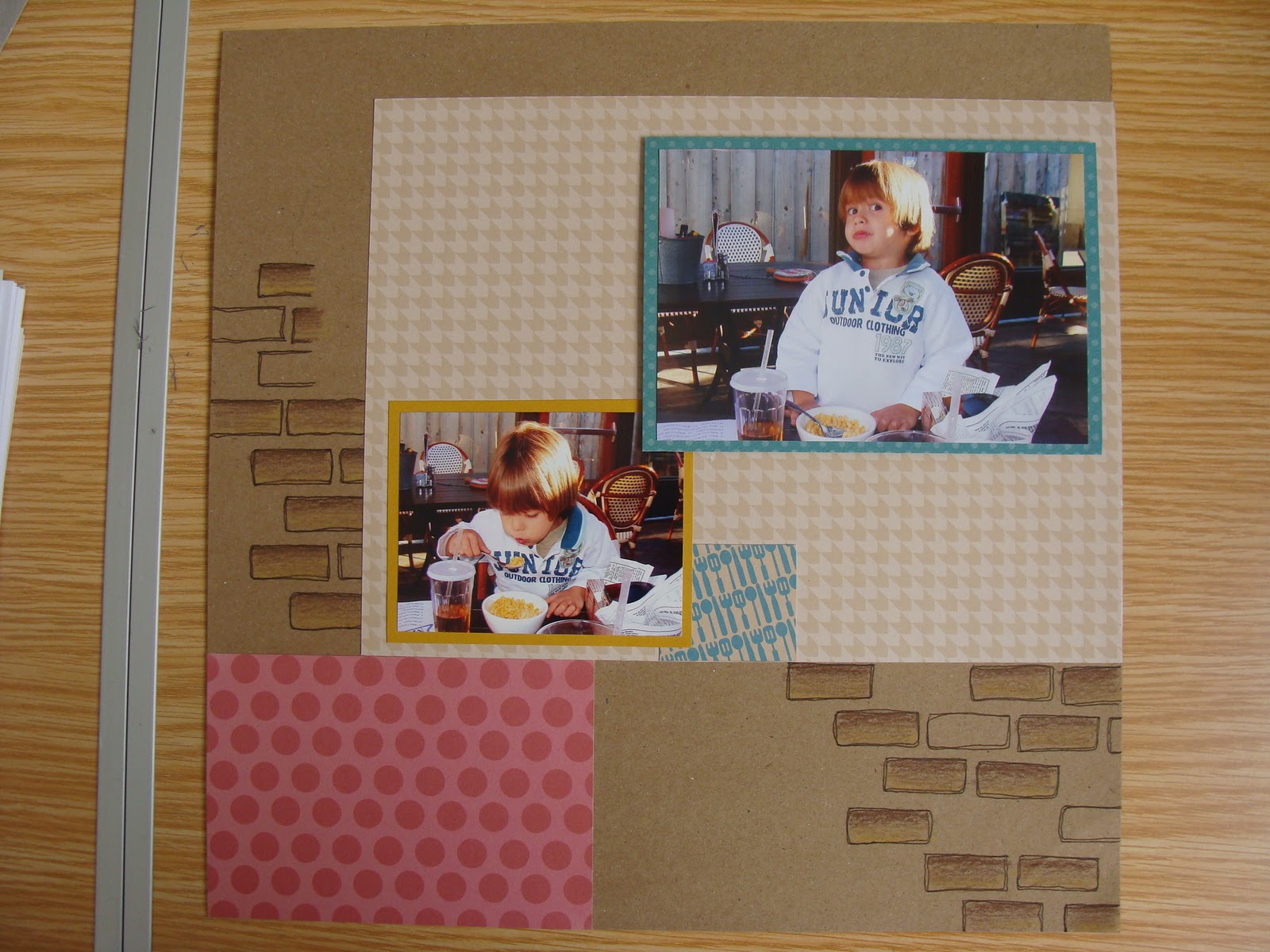 1) Sem colar ainda, posicionem o retângulo de papel rosa de bolinhas no canto inferior esquerdo, e o retãngulo grande de papel bege em cima dele, encostando do lado direito da página. As fotos, já nos tapetes, vão no retângulo bege como vocês vêem na foto, uma se sobrepondo um pouquinho na outra, com a janelinha acima da foto pequena, encostando nela e entrando no cardstock craft à esquerda. Agora risquem o contorno dos retângulos de papel e da janela para vocês terem uma referência para desenhar os tijolos.