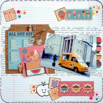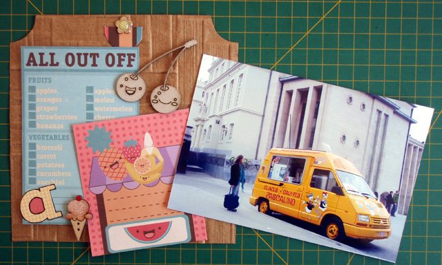 - tapetes amarelo (papel Sushi - lado amarelo ou cardstock liso) e azul (papel Daidokoro - lado de bolas azuis ou cardstock liso) para as fotos, formando moldura de no máximo 0,5 cm de largura