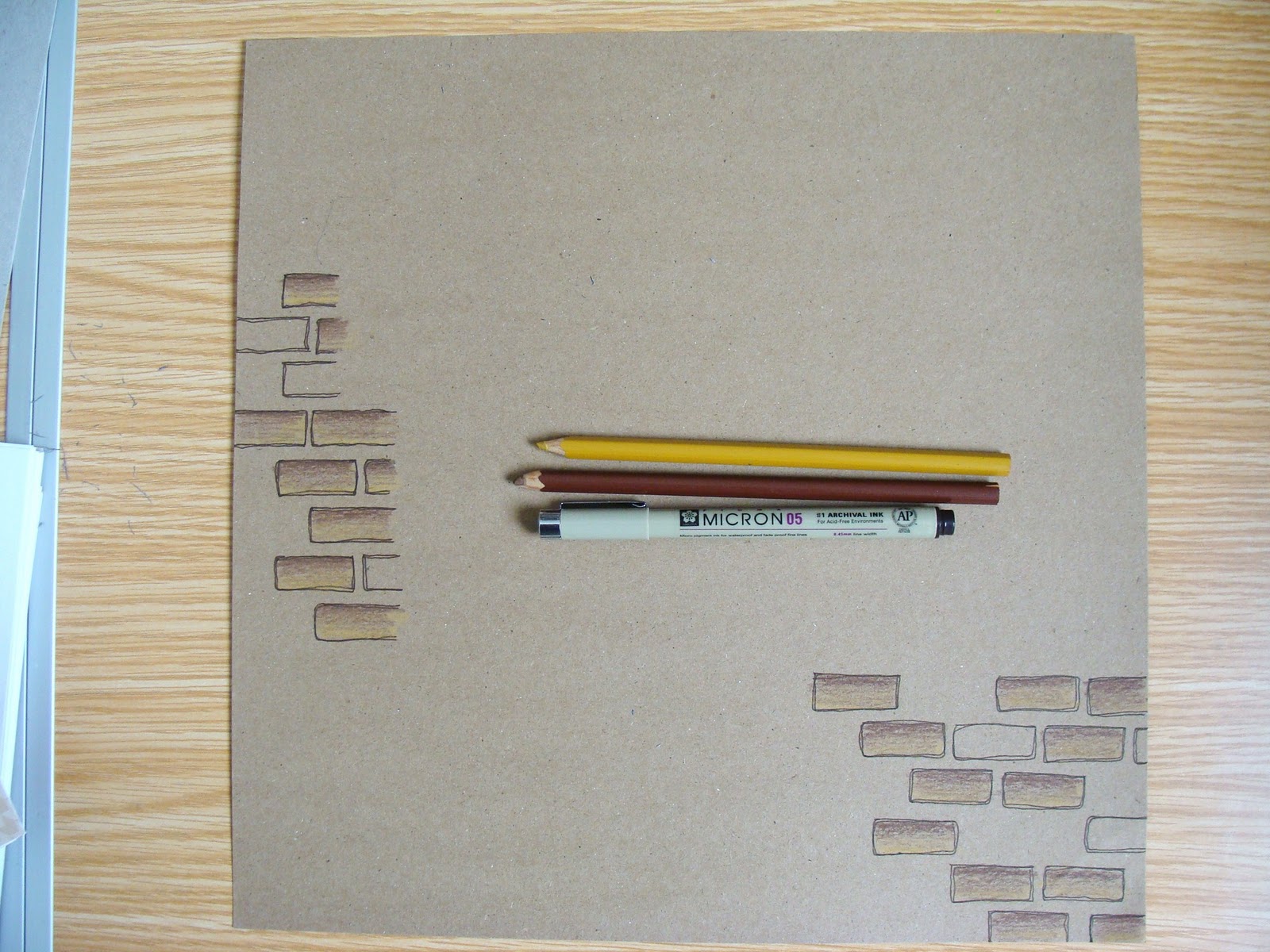 3) Contornem os tijolos com caneta marrom, fazendo um contorno duplo para ficarem mais naturais. Com os lápis marrom e ocre, pintem a maioria dos tijolos. Deixem um ou outro sem pintar.