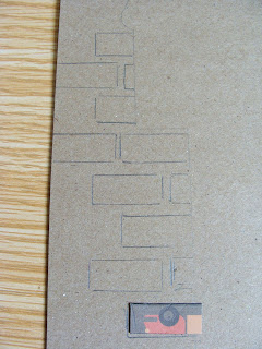 2) Usando o retângulo de cardstock, desenhem os tijolinhos no papel de base, do lado esquerdo da janela.