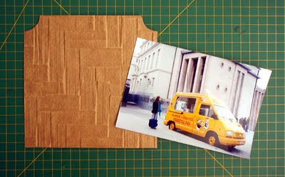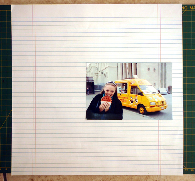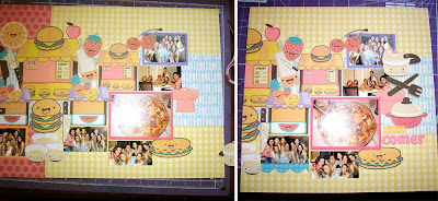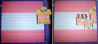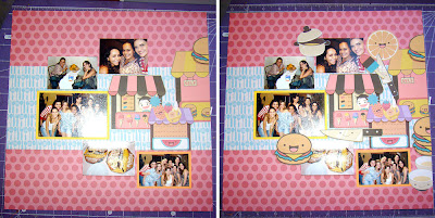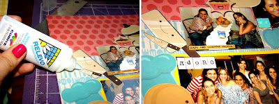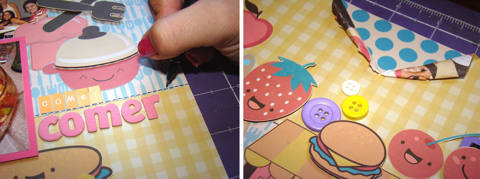 4) Agora, já podemos colar os retângulos de papel, e as fotos com os tapetes. Colei a maior com fita banana, e o quadradinho dos talheres ficou com uma parte por baixo da foto menor.