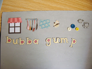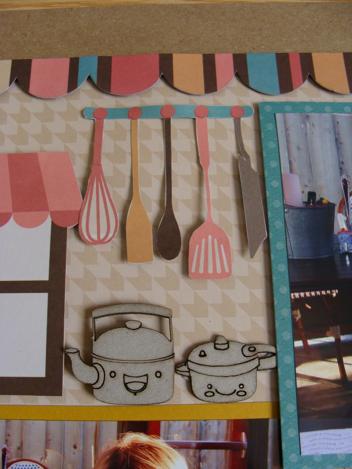 8) Cole-o entre a janela e a foto maior, usando cola na parte de cima e as fitas banana na parte de baixo. Cole os chipboards de panela e chaleira nesse mesmo espaço, mas logo acima da foto menor. Eu usei cola na panelinha e fita banana na chaleira.
