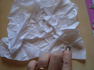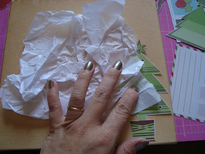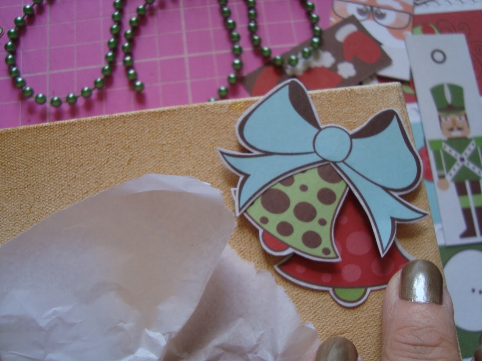 Colei um retalho de papel de seda no centro da tela. Observe que colei apenas no meio para que pudesse ir encaixando alguns elementos por baixo.