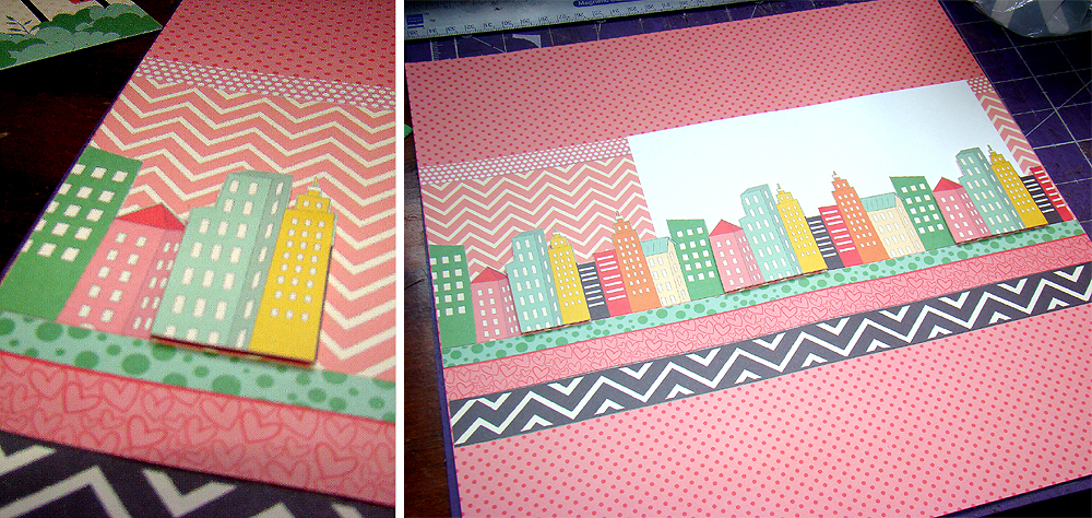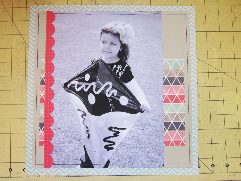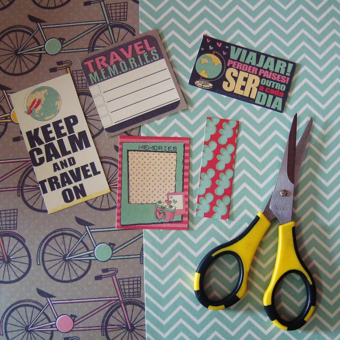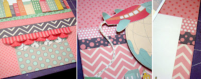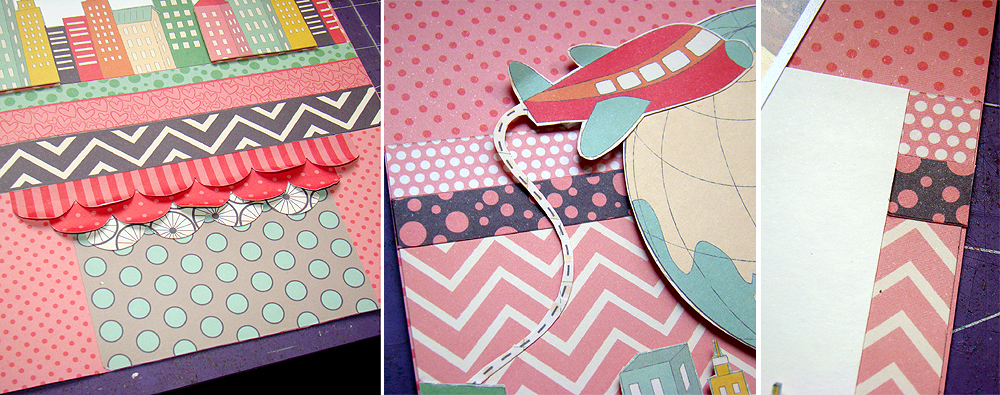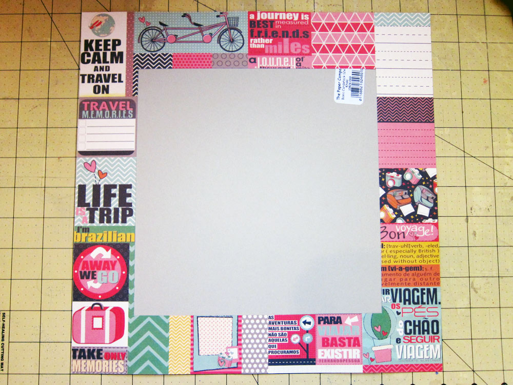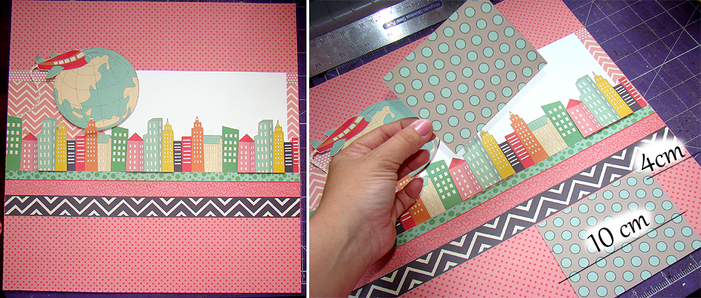 Depois, encaixe as bordas escalopadas dos papéis Around the World e Say Cheese e dois cards de estampa do papel Journey Quotes, como mostra a foto abaixo.