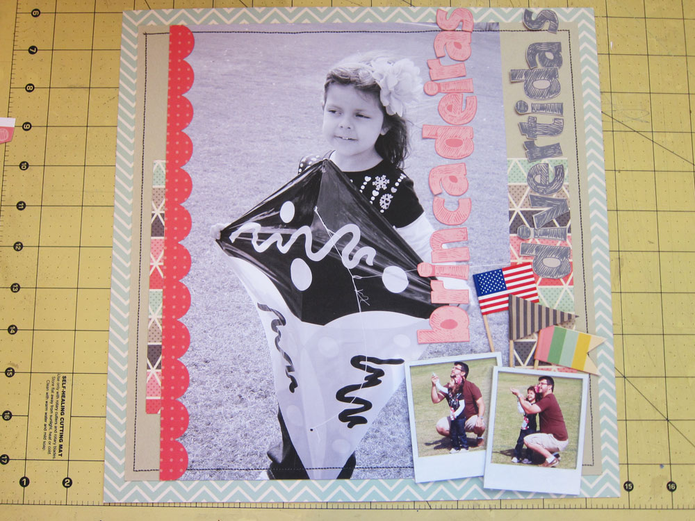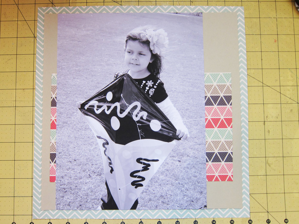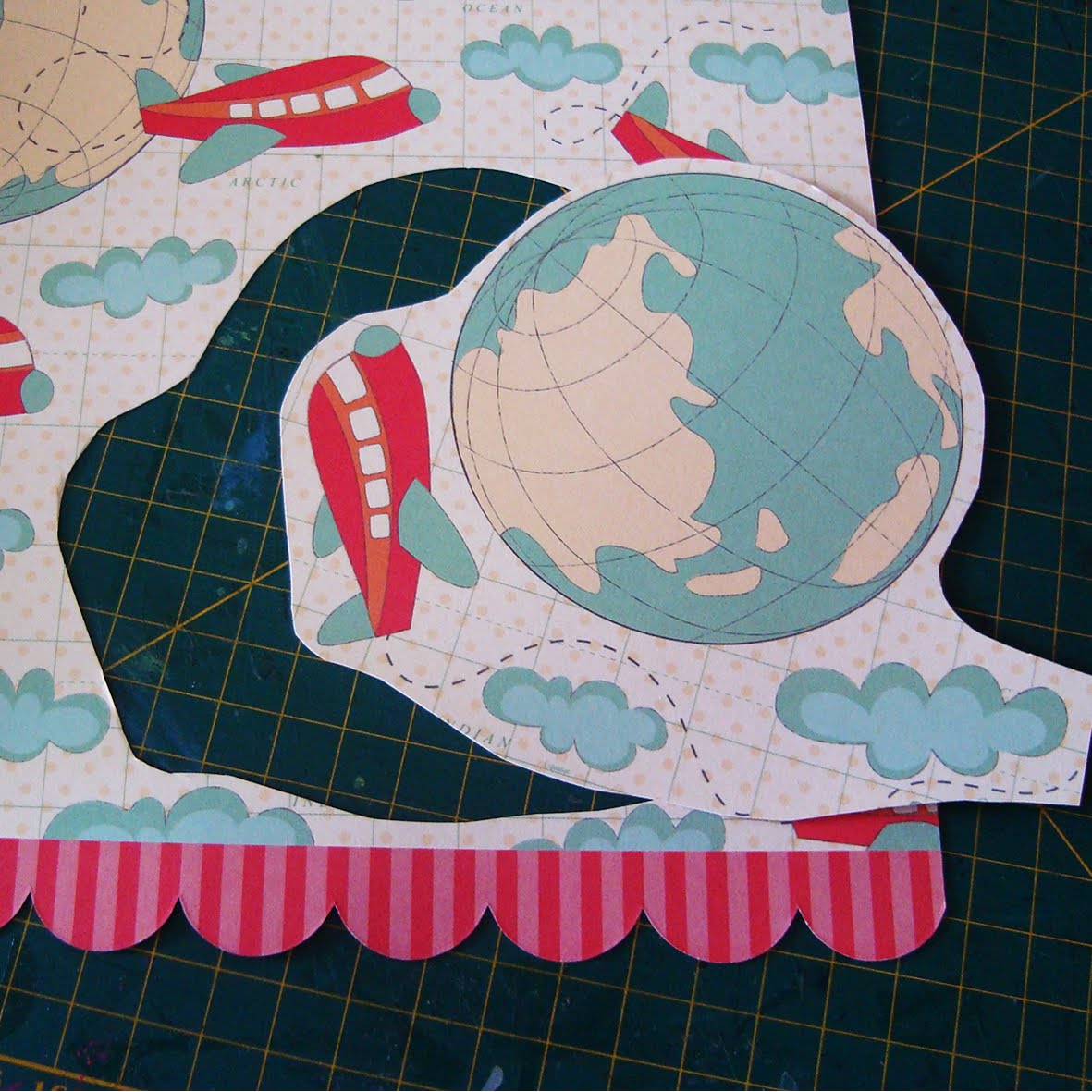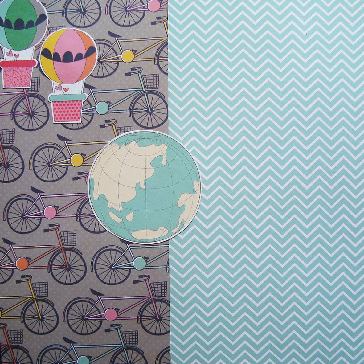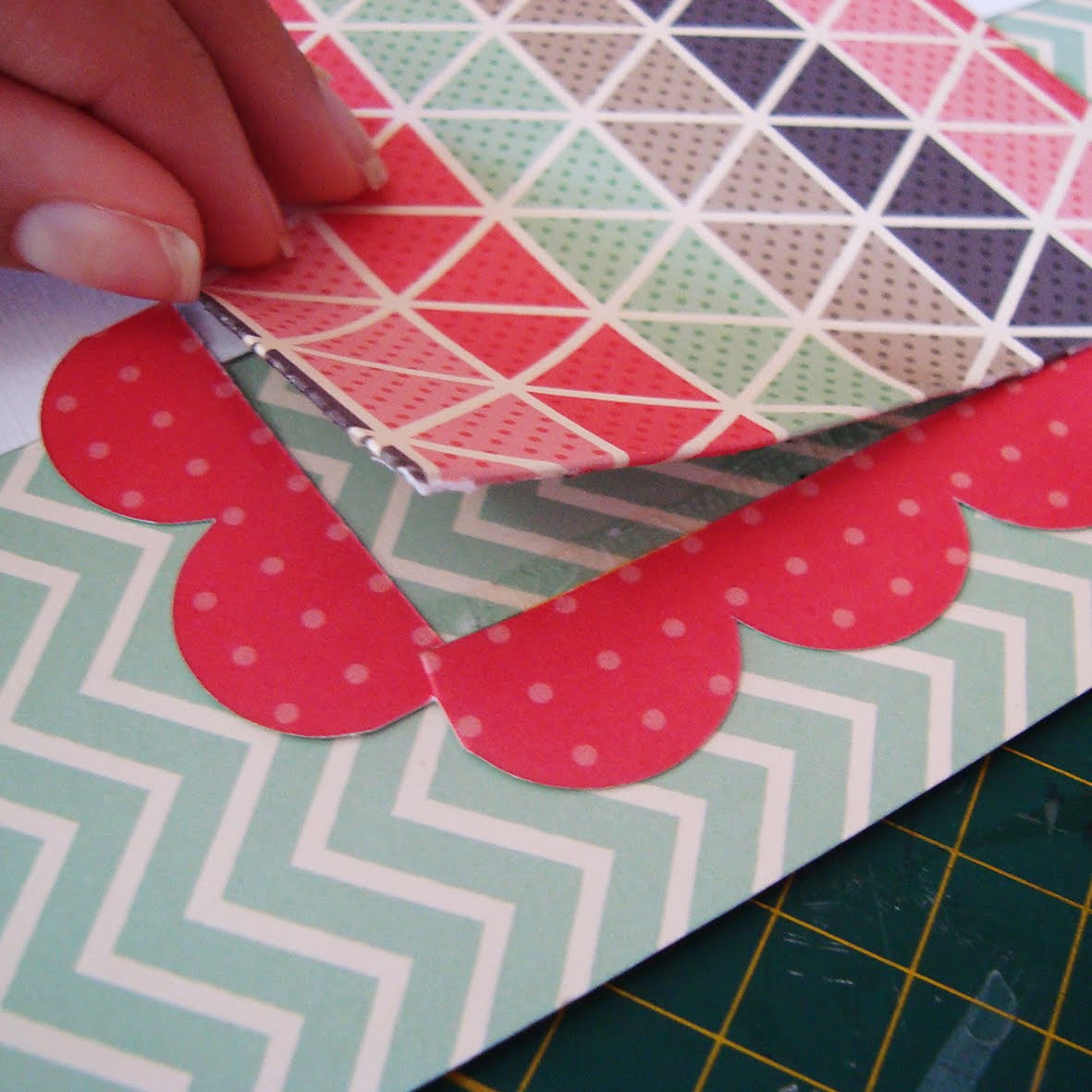 Depois, encaixe as bordas escalopadas dos papéis Around the World e Say Cheese e dois cards de estampa do papel Journey Quotes, como mostra a foto abaixo.