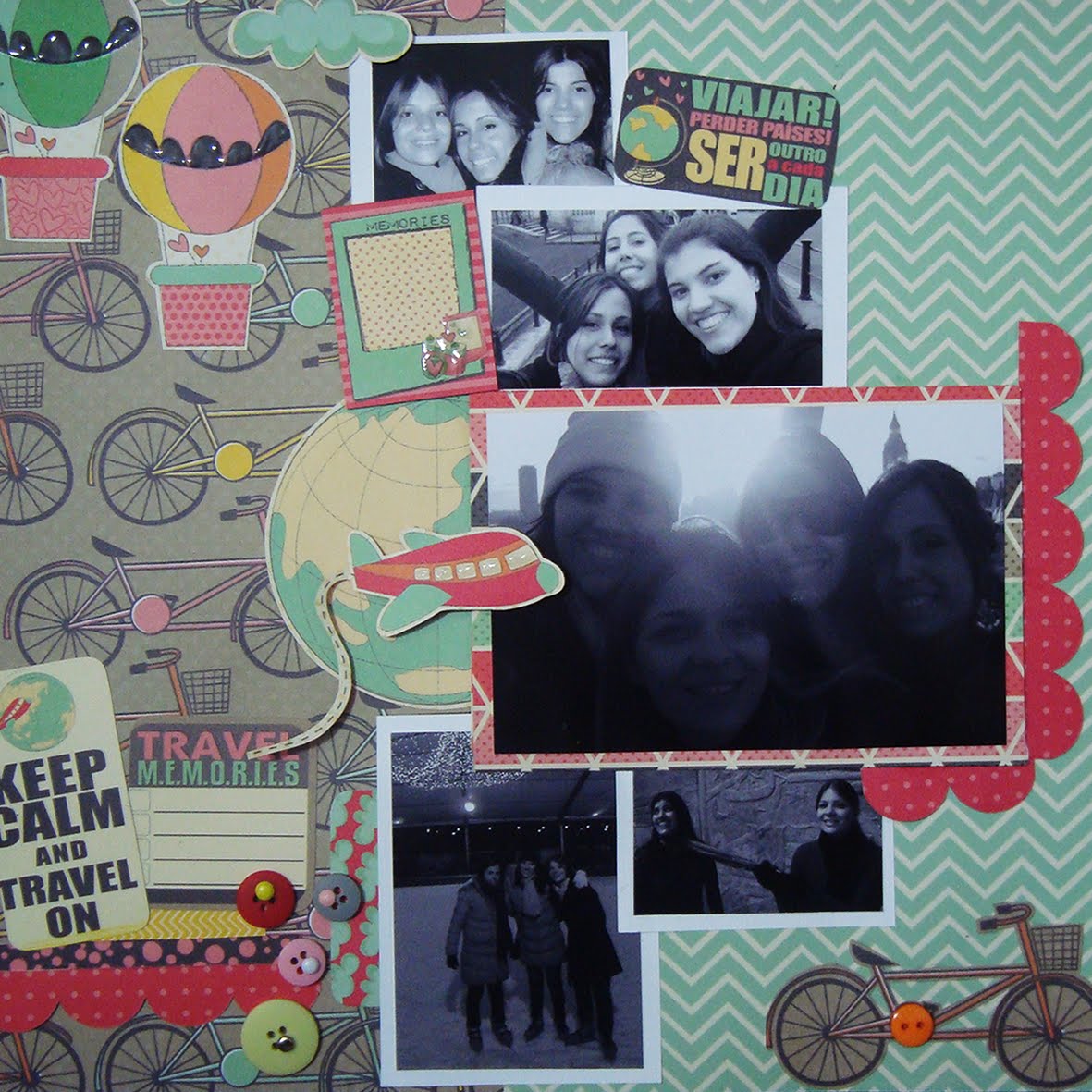 Depois encaixe por baixo da foto central mais dois cards do papel Journey Quotes (usei o verde com a polaroid e o Travel Memories), por cima dos cards estampados colei o KEEP CALM e ainda, no canto direito, mais um card estampado. Em seguida, com fita banana, prenda uma máquina polaroid do papel Say Cheese no canto esquerdo e uma mala do papel Journey Quotes no canto direito, como mostra a foto.