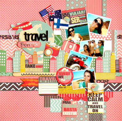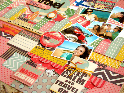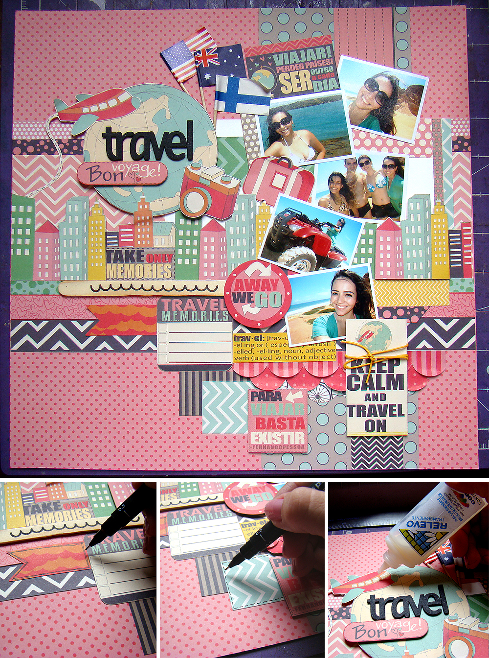 Depois, pintei com canetinha o chipboard Travel, que será o título da minha página, e colei-o no canto direito do LO, abaixo da mala.