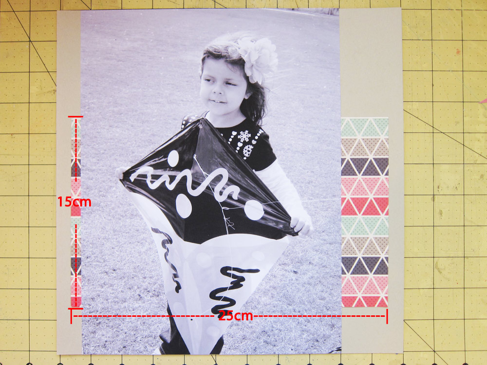 Depois, posicione e cole a sua foto com fita banana mais ou menos no centro da folha. Notem que eu usei um mini prendedor para dar um charme a mais, mas é totalmente opcional.