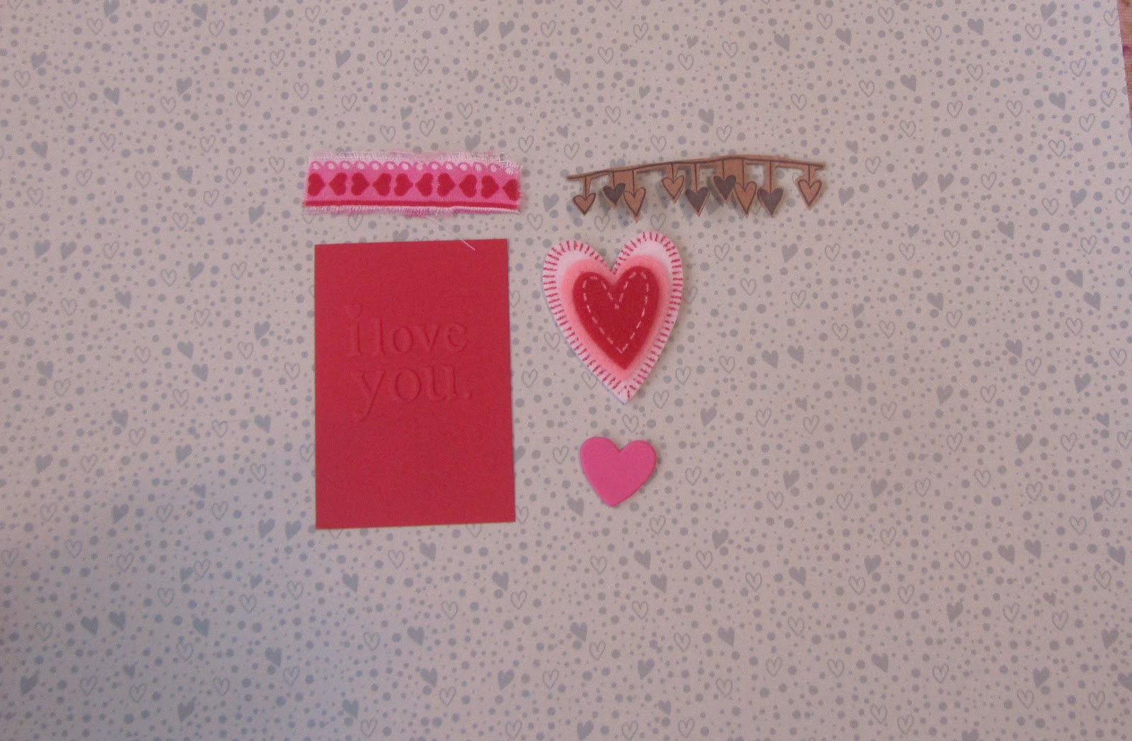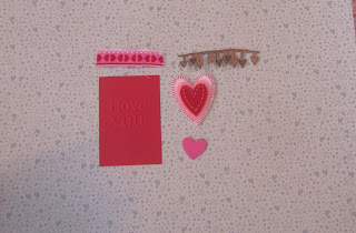 Depois, vai separar uma tira do tecido, o card, a carimbada do varalzinho de corações, devidamente recortada e o coração de feltro. O coração menor está aí de alegre. Não será usado.