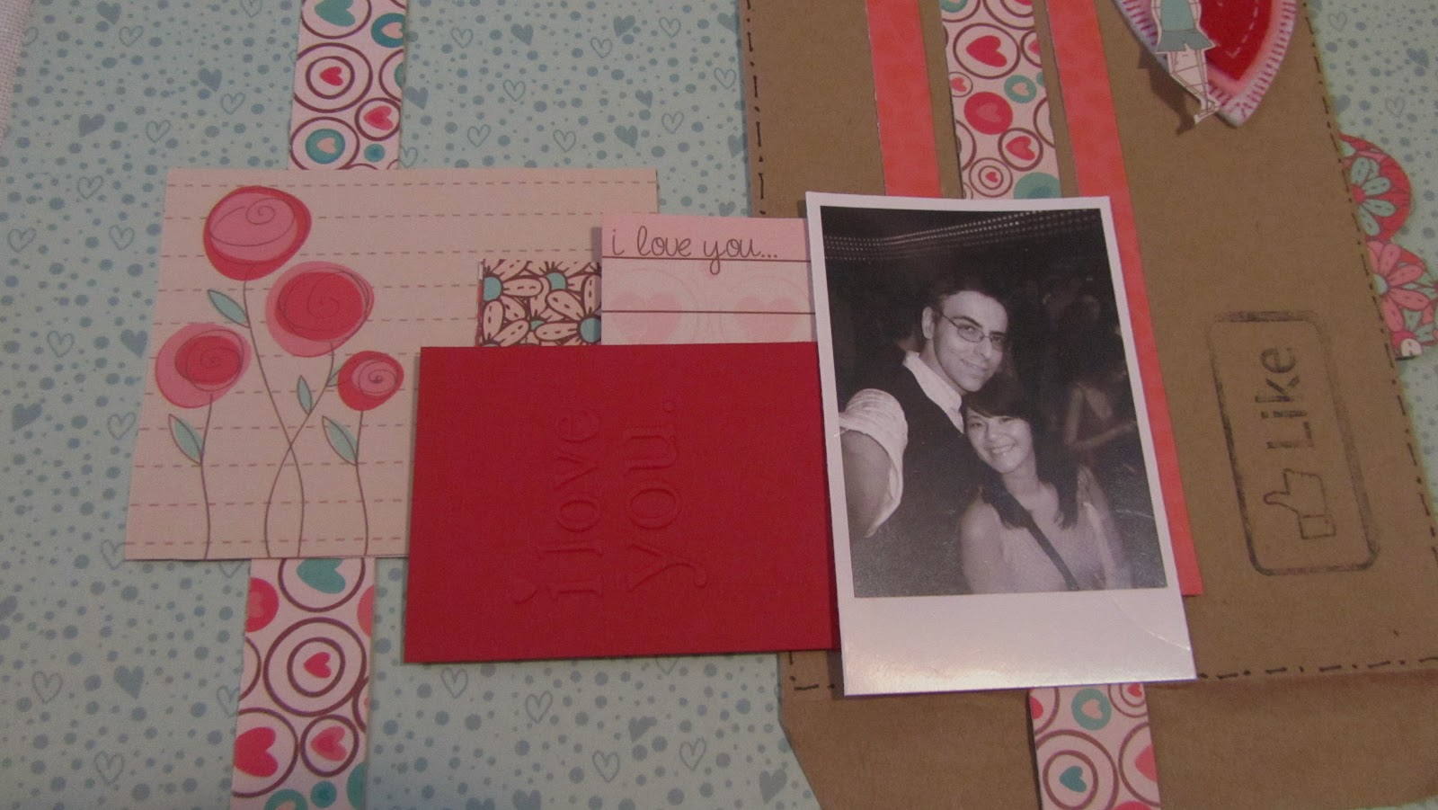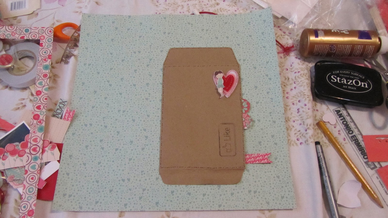 No envelope, cole o coração de feltro e em cima dele, com fixe o menino e a menina (que não aparece nesta foto, porque eu a perdi no meio da zona, mas no final achei. Então, ela só vai aparecer lá embaixo, ok? Bizarrices que acontecem quando se faz um PAP. #ficaadica), dê uma carimbada com Like, faça uma banderinha e cole um pedacinho da borda florida. Tudo feito? Agora é só colar na base Clementine & Joel. Se você quiser, você pode descolar o envelope para deixar mais uma aba em baixo.