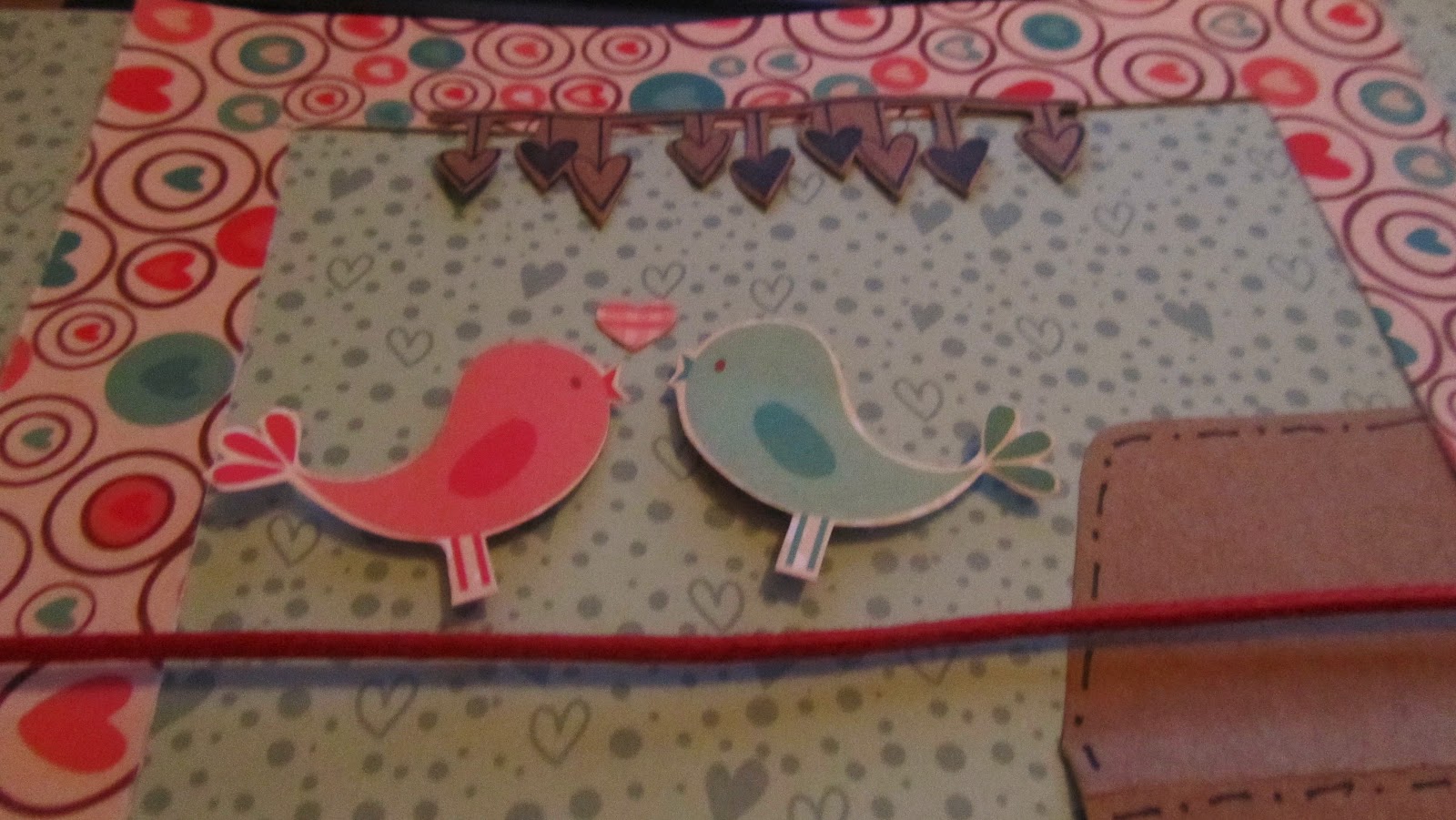 E para fechar, pendurei a carimbada do varal, peguei o cordão rosa, dei um nó, colei nas flores de acrílico e fiz um segundo varal, onde dois passarinhos namoram felizes.