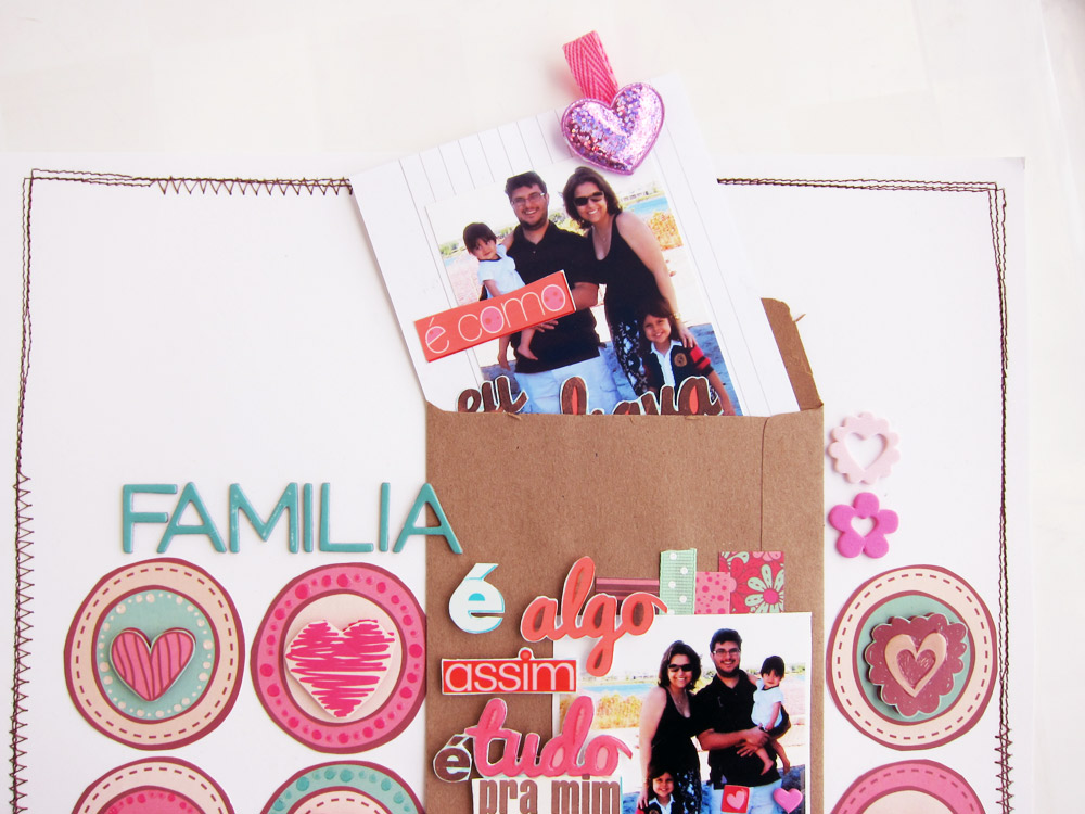Cole os circulos e o envelope no cardstock branco, conforme a foto. Se for costurar a borda, faça isso antes de colar tudo!!!! Eu fiz depois, pois a ideia veio depois, e me dei mal!!!!!