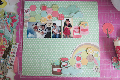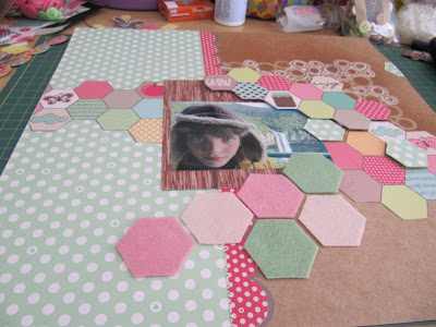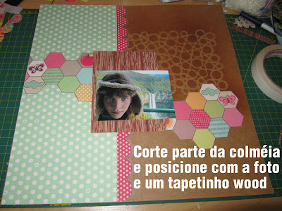 Recorte três pedaços do papel de colméia e cole assim pra fazer umas flores que saem da fita.