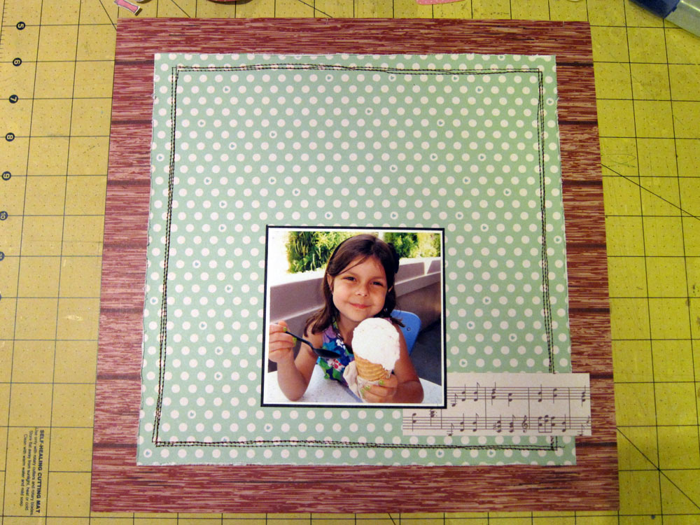 Comecei meu LO colando uma foto colorida 10x10cm em um tapete de cardstock branco de 10,5x10,5 e então colando sobre um tapete preto de 11x11cm.