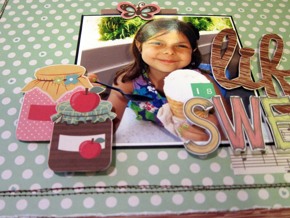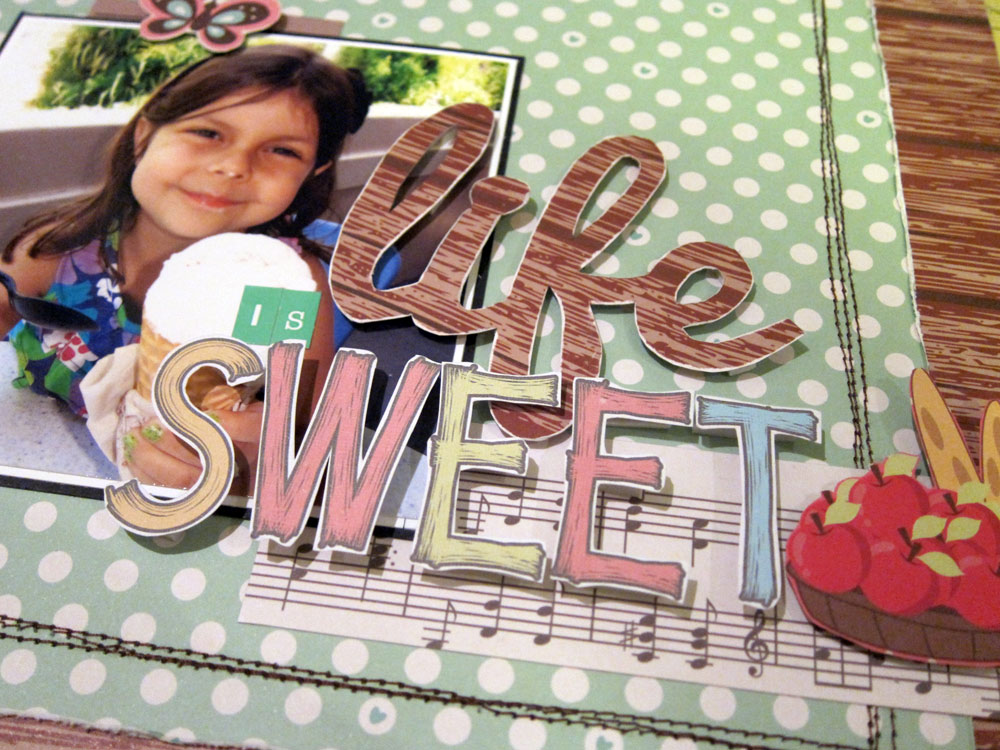 Cole a palavra LIFE com 1 camada de fita banana e o resto do seu título usando os Pintables e 2 camadas de fita banana. Eu completei ainda com um mini alfabeto. A cesta com maças eu recortei do papel Cards.