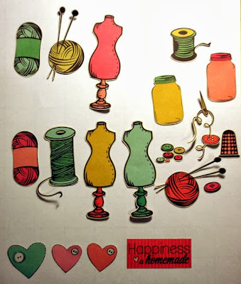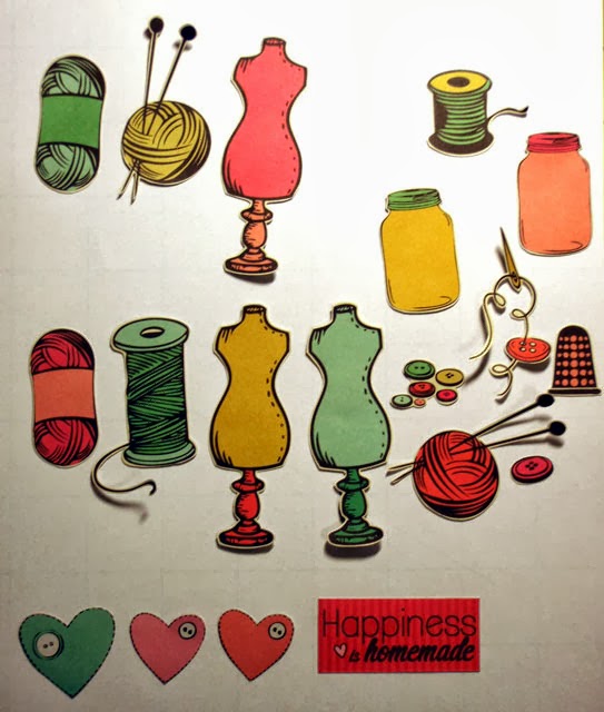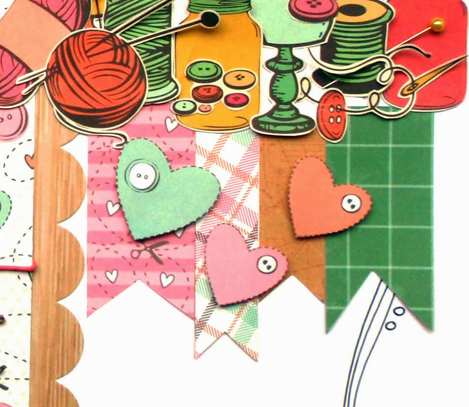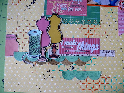 Aqui em cima, mais alguns recortes, carimbadas e botões...