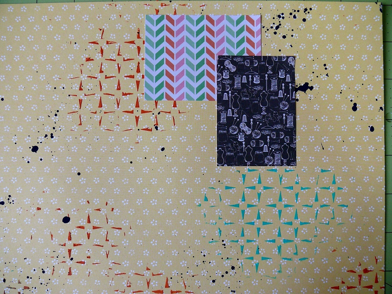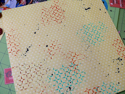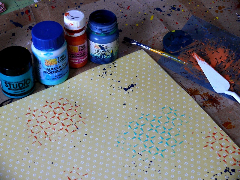 Eu fiz algumas texturas usando uma mistura de tinta turquesa com massa acrílica e outra mistura de tinta laranja com massa acrílica e usei o mesmo stencil para trabalhar com as duas misturas de tintas.