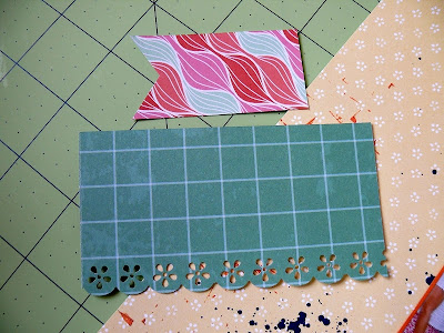 em seguida, faça uma pequena bandeirola e corte um pedaço do papel "base de corte" e trabalhe a borda inferior com algum furador de borda...