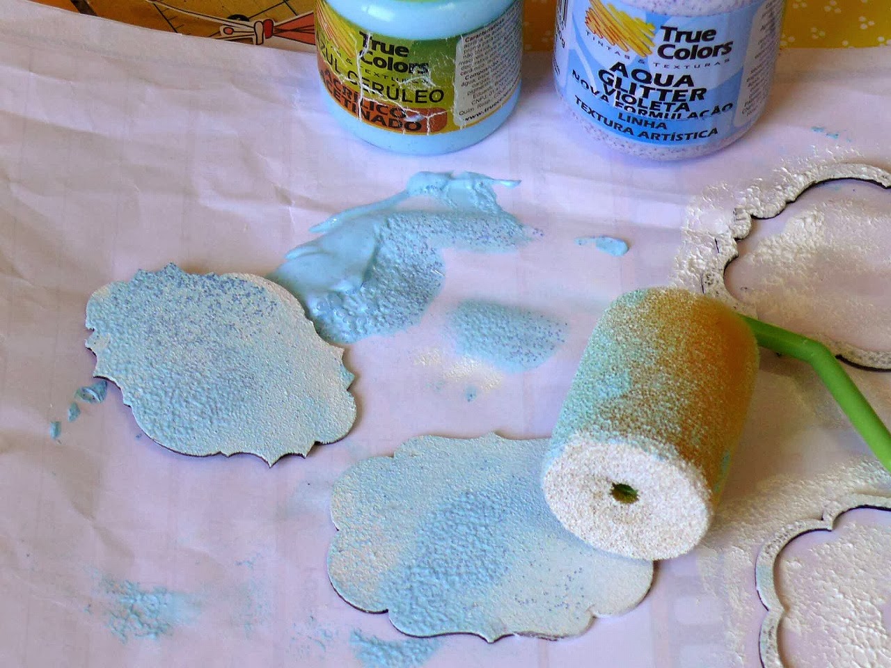 eu usei tinta acrílica azul Ceruleo, misturada com Aqua Glitter Violeta, da True colors.