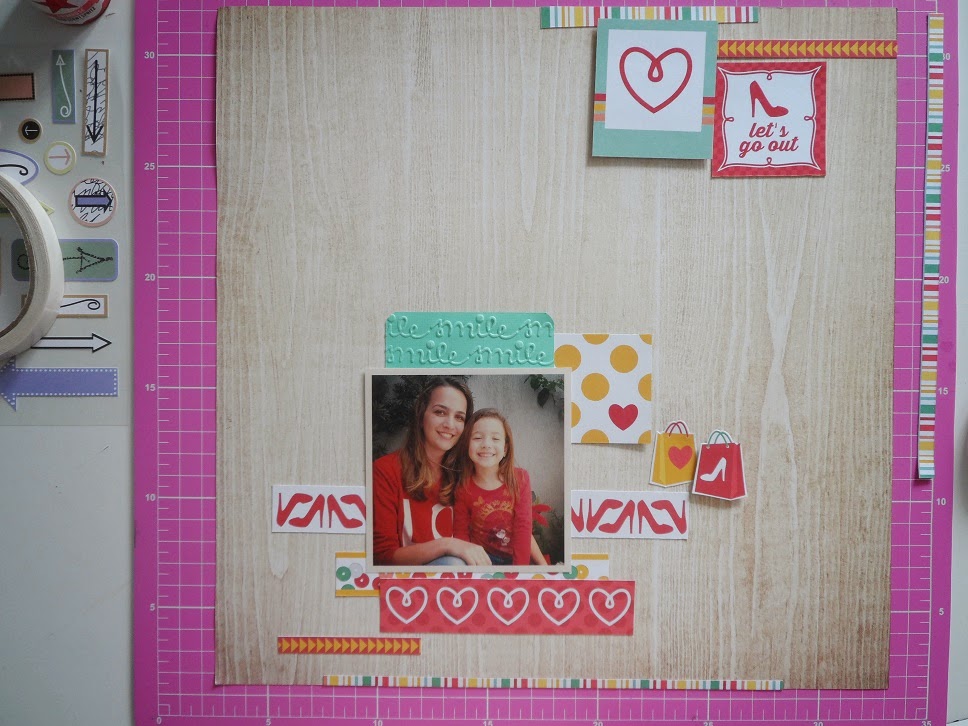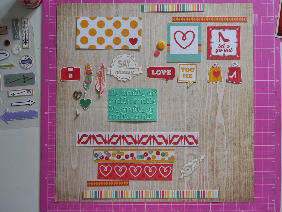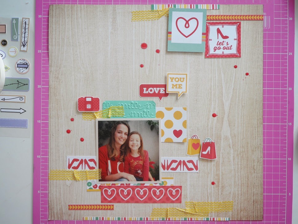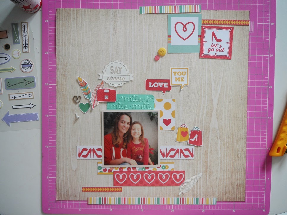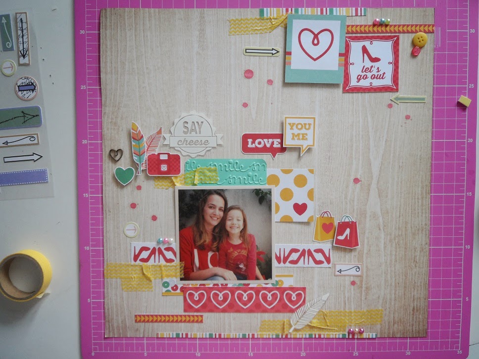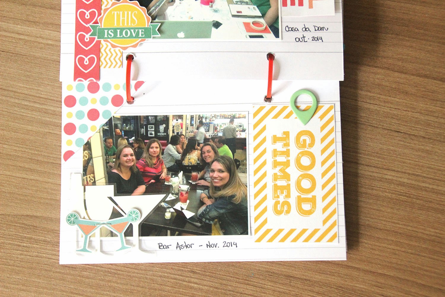 Nessa página, colei uma foto grande com moldura e duas pequenas para contrastar. No fundo da página das fotos pequenas, eu usei o card de setinhas, botão, câmera...