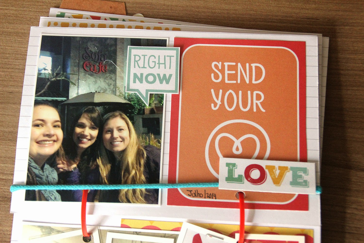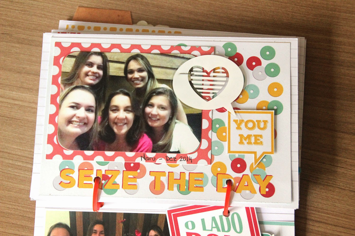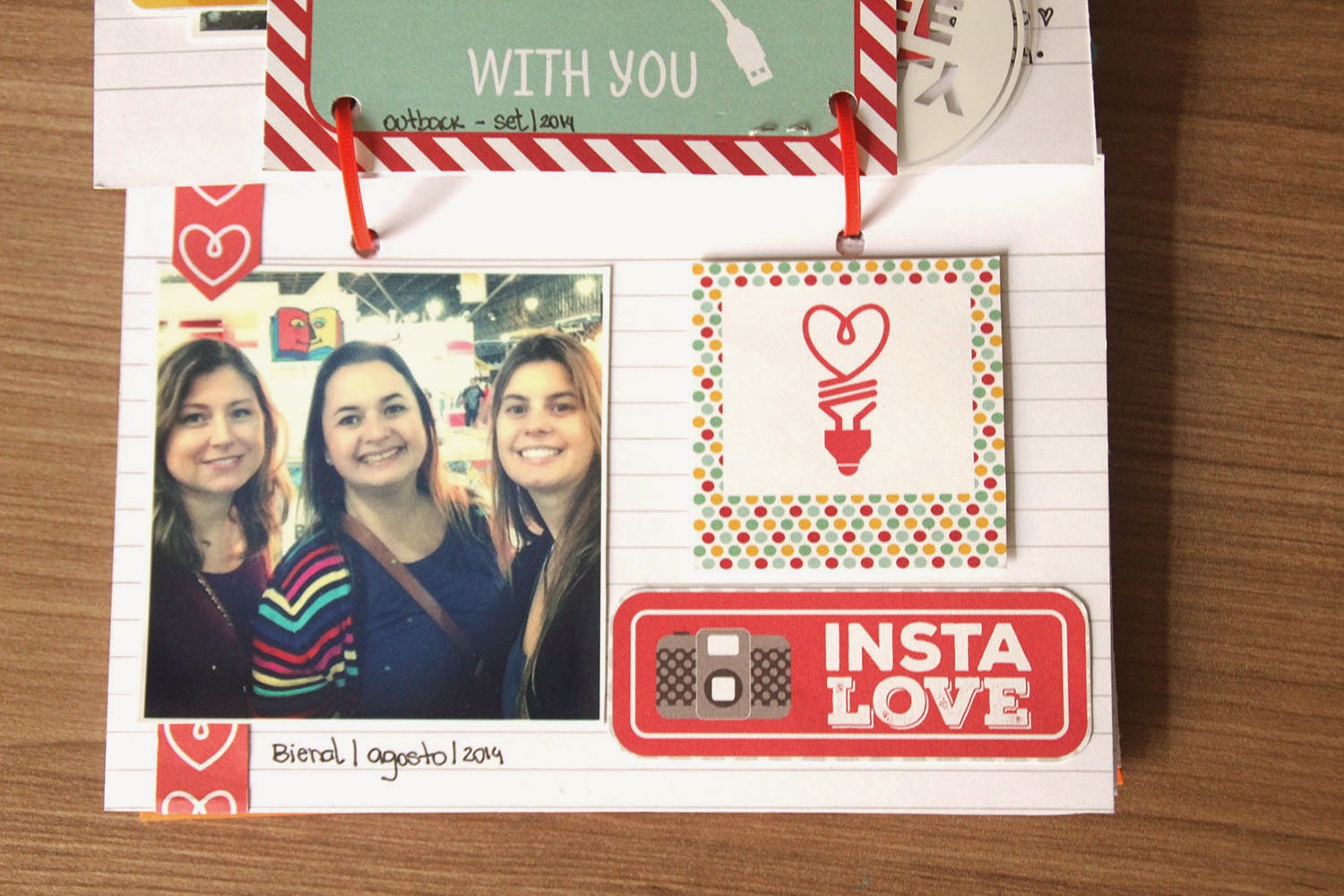 Eu adoro pockets! Botar uns enfeites recortadinhos sempre dá um charme no mini! Usei o card CRIATIVE para fazer o bolso, colando por cima o dizer SAVE MEMORIES. Colei também uma tirinha vermelha na parte de cima, para dar acabamento. Dentro do bolso coloquei duas peninhas grandes, uma fotinho com moldura de bolinha e dois tags.