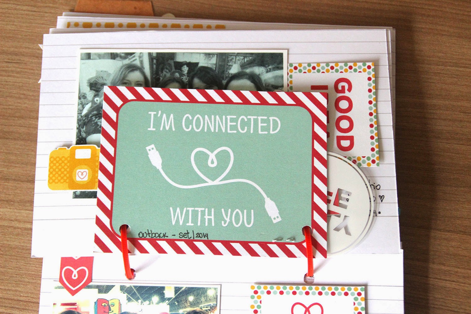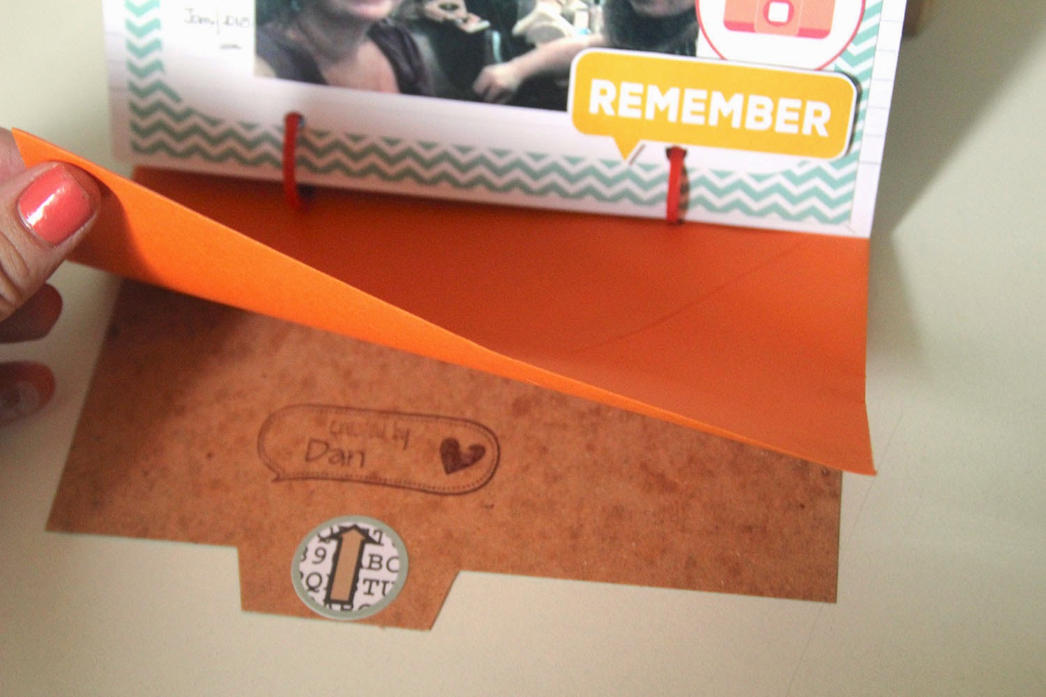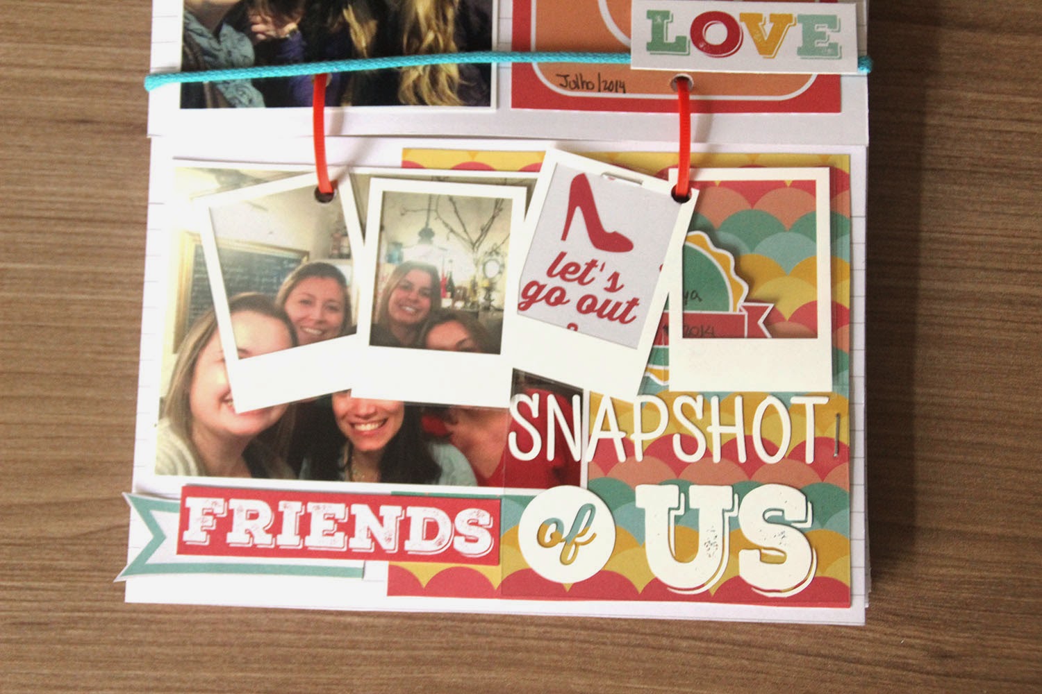 Eu adoro pockets! Botar uns enfeites recortadinhos sempre dá um charme no mini! Usei o card CRIATIVE para fazer o bolso, colando por cima o dizer SAVE MEMORIES. Colei também uma tirinha vermelha na parte de cima, para dar acabamento. Dentro do bolso coloquei duas peninhas grandes, uma fotinho com moldura de bolinha e dois tags.