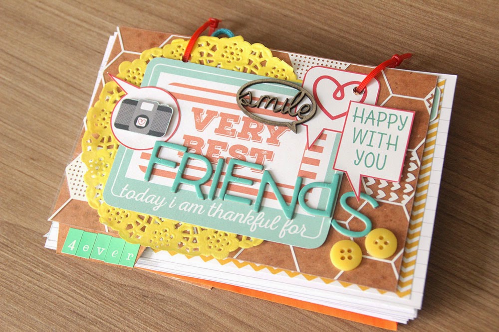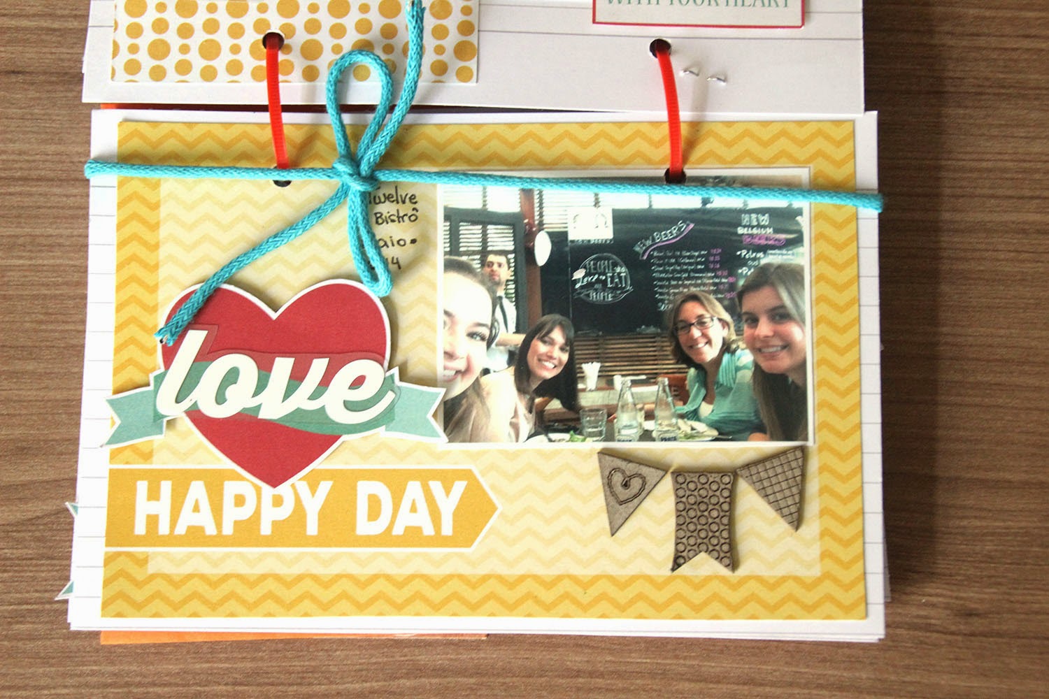 Agora, cole os corações de chipboard e a plaquinha THANK YOU na capa do mini. Na parte de baixo, cole uma pequena faixinha da tirinha da folha STRIPE e cole adesivos com a data do mini.