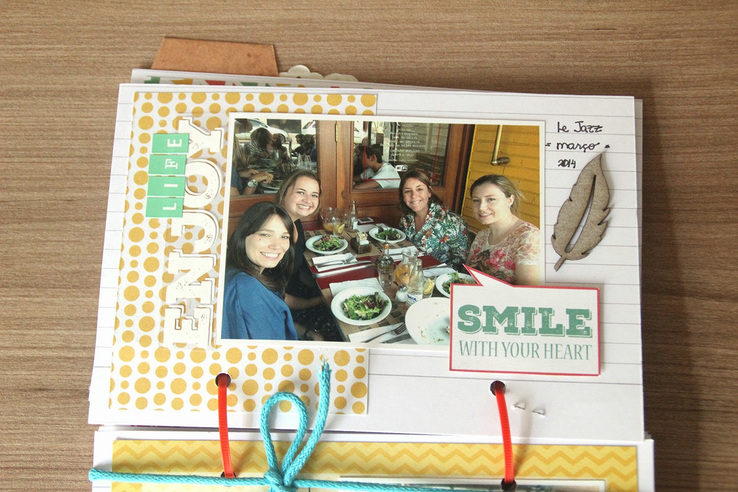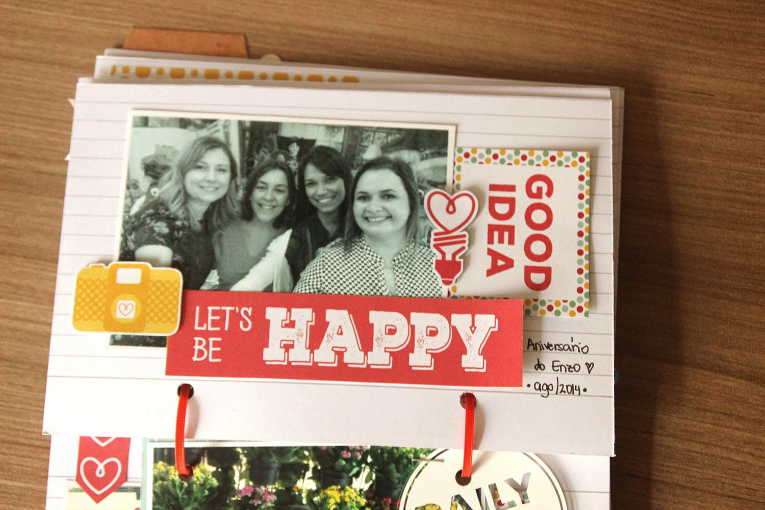 Na última página, colei a tira LET'S BE HAPPY e uma foto na vertical. Colei uma tirinha bem fina do papel de bolinha, só para dar acabamento. Na última página, colei várias lantejoulas no Card YOU LIGHT UP MY LIFE.