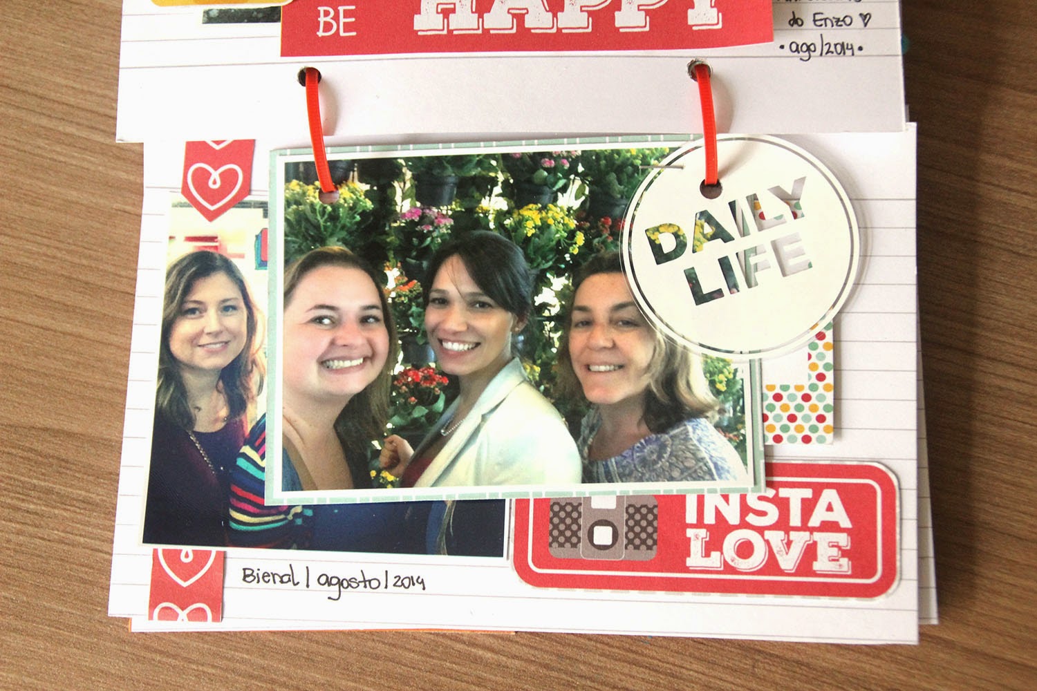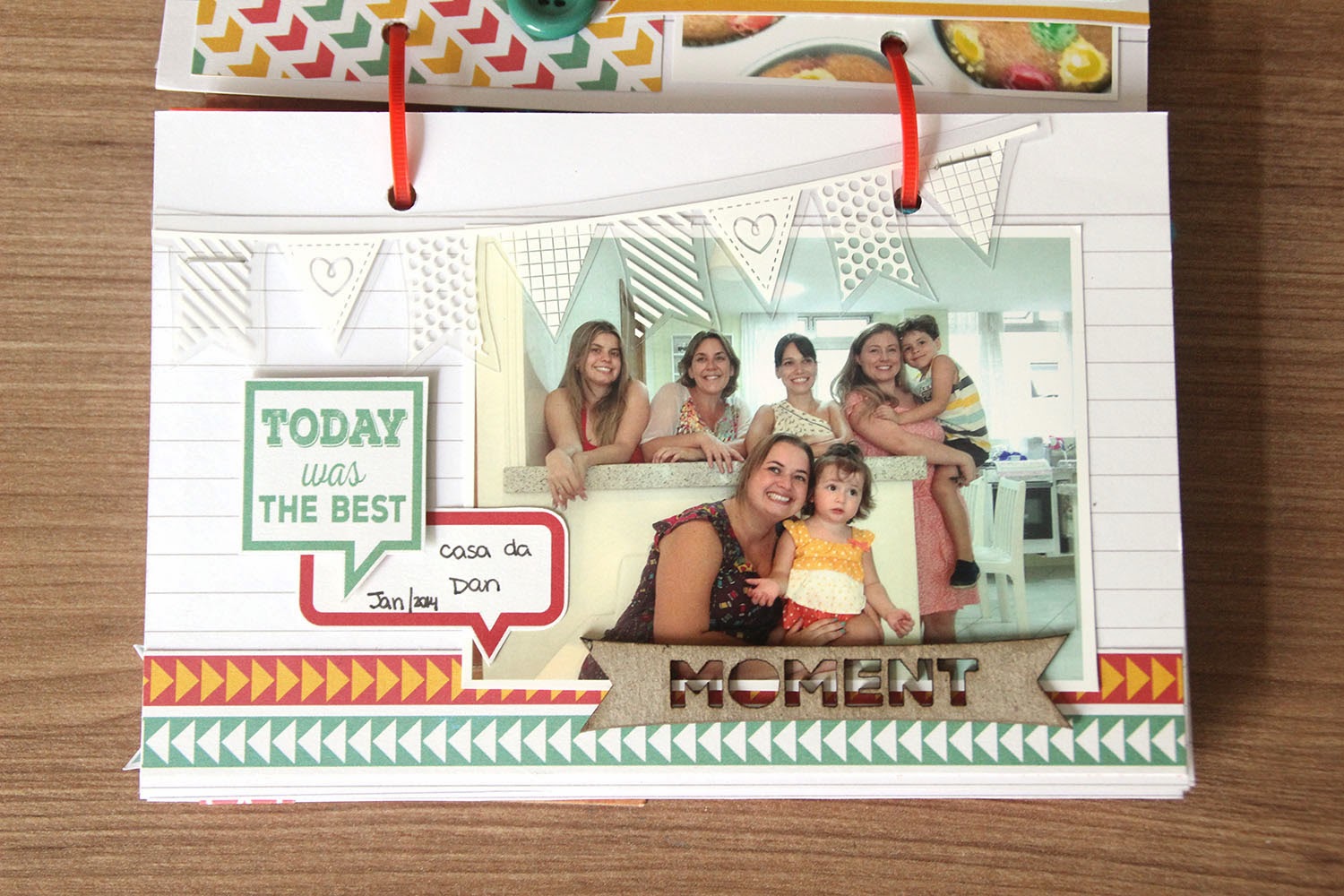 Vamos decorar a parte de dentro! Na primeira página cole um card de texto e escreva um pouco sobre as fotos do mini. Uma dica é colar os botões antes de escrever o texto, para ficar bem acabado. Na outra página, recorte o miolo da moldura Oh yeah! e cole uma foto divertida por trás.