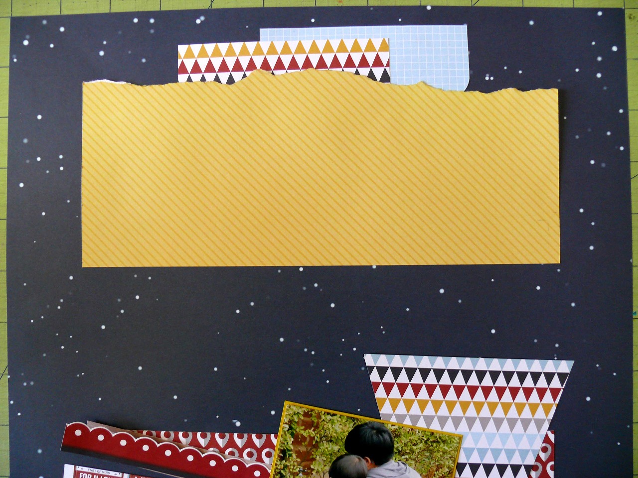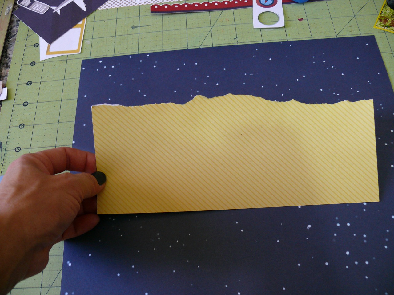 -e uma tira de 3 cards do papel de verso amarelo, que você vai fazer um detalhe na parte superior, usando a tecnica do papel rasgado assim, como você vê abaixo.