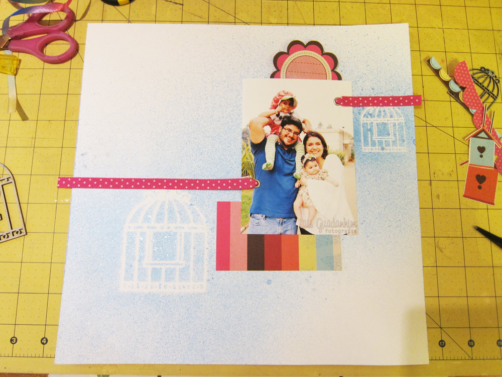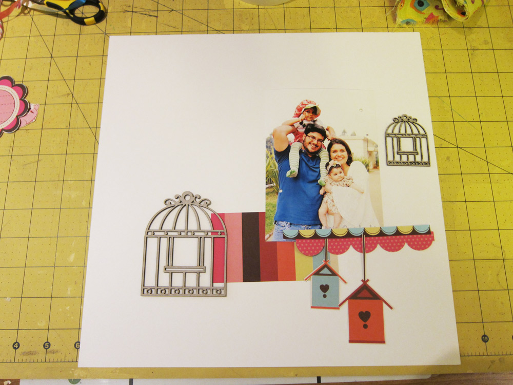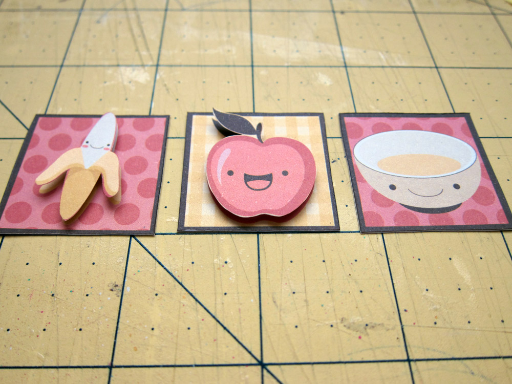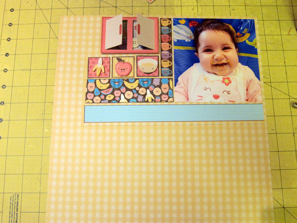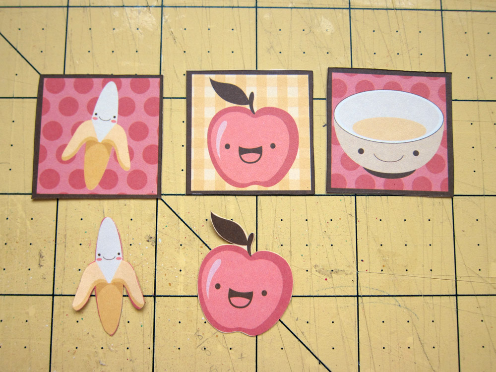 Cole sua foto, seu shaker box, os quadradinhos e mais alguns retangulos que desejar sobre o papel Sushi. Eu usei 2 bordas dos Printables. Deixe aproximadamente 0,5cm de distancia entre cada figura. Percebe como eu preenchi os espaços?