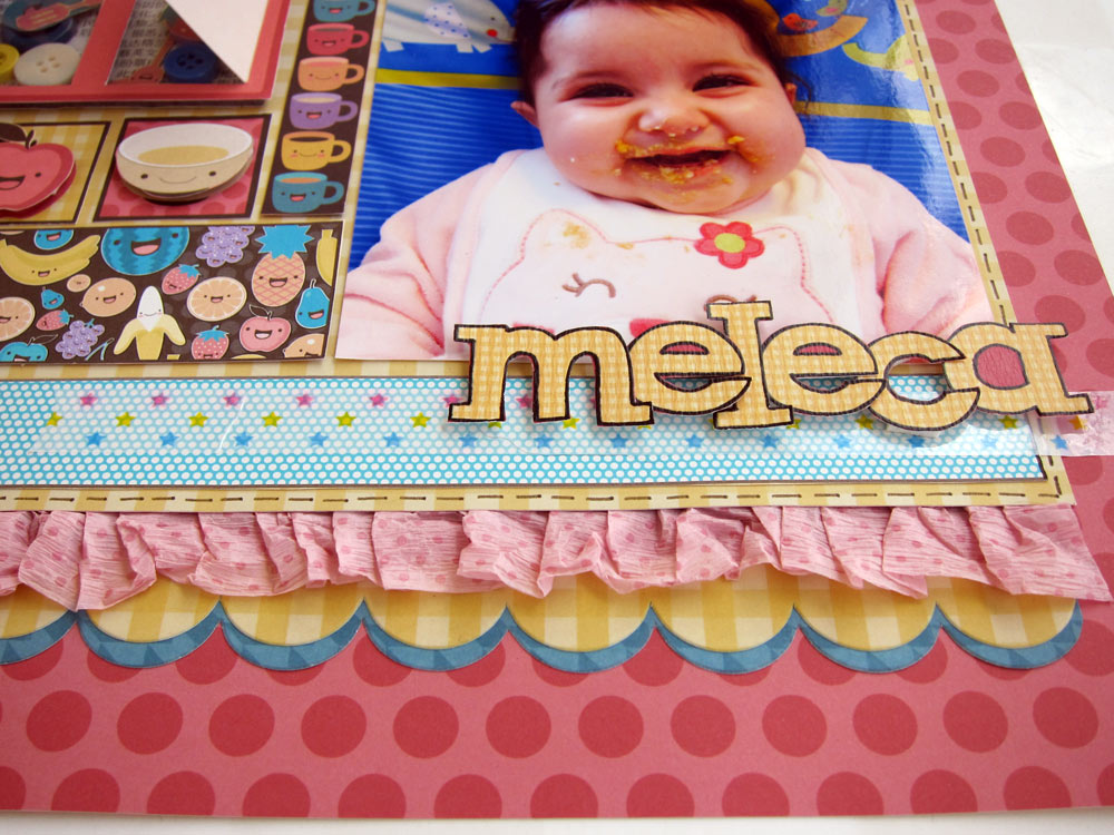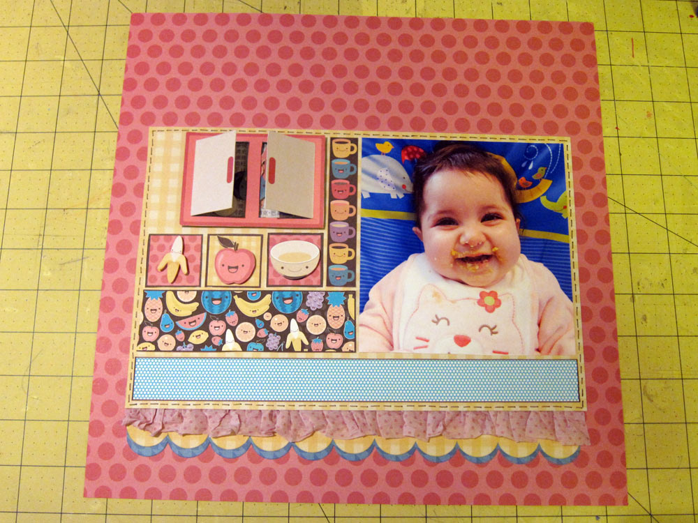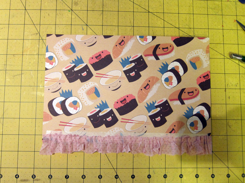 Cole este retângulo sobre uma folha Sandoitchi. Eu ainda usei a bordinha decorada deste papel e do Sushi para dar um acabamento embaixo do babado de crepon.....
