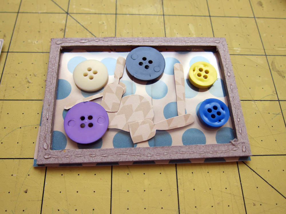 Pelo verso da janela, coloque algumas coisas dentro do seu chipboard. Eu usei botões e recortes..... Procure não colocar nada muito alto. Preste atenção que os recortes por exemplo devem estar do lado "certo".... Ou seja, virados para baixo.....